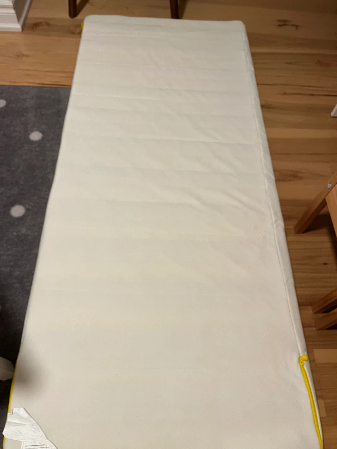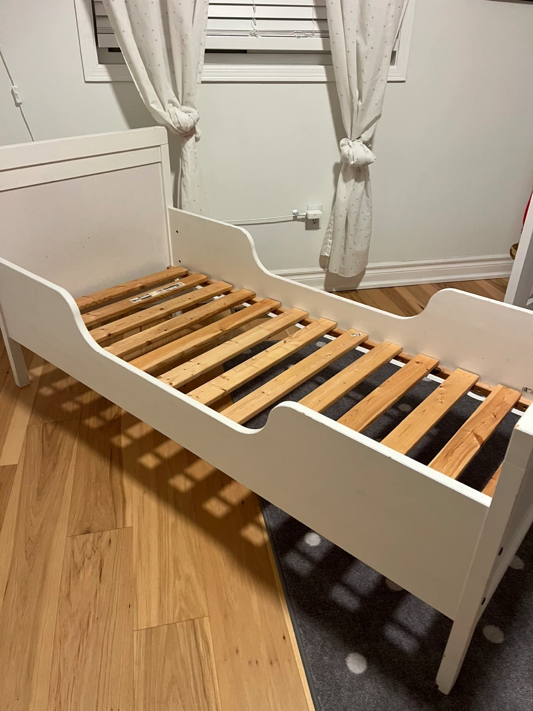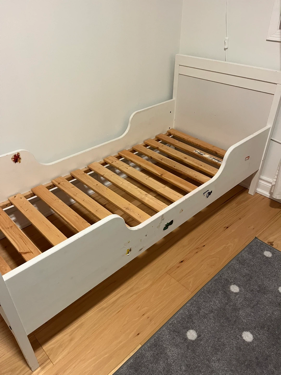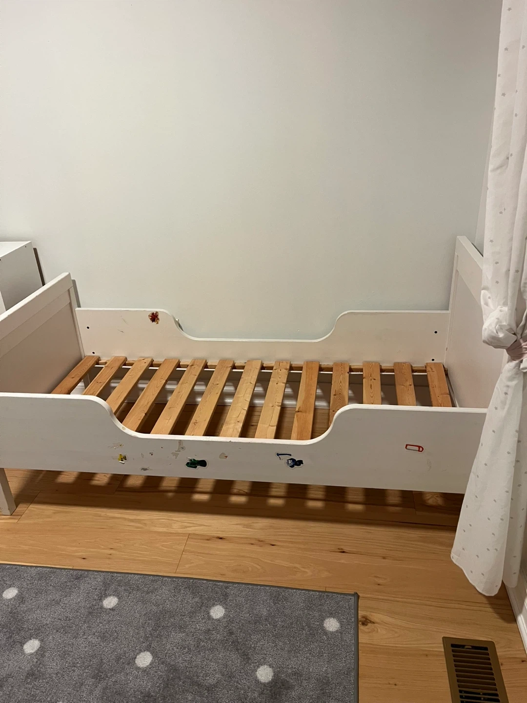 Selling an IKEA Sundvik Bed with mattress. It's in good condition and includes a mattress. The mattress has some stains but the cover is removable and washable.