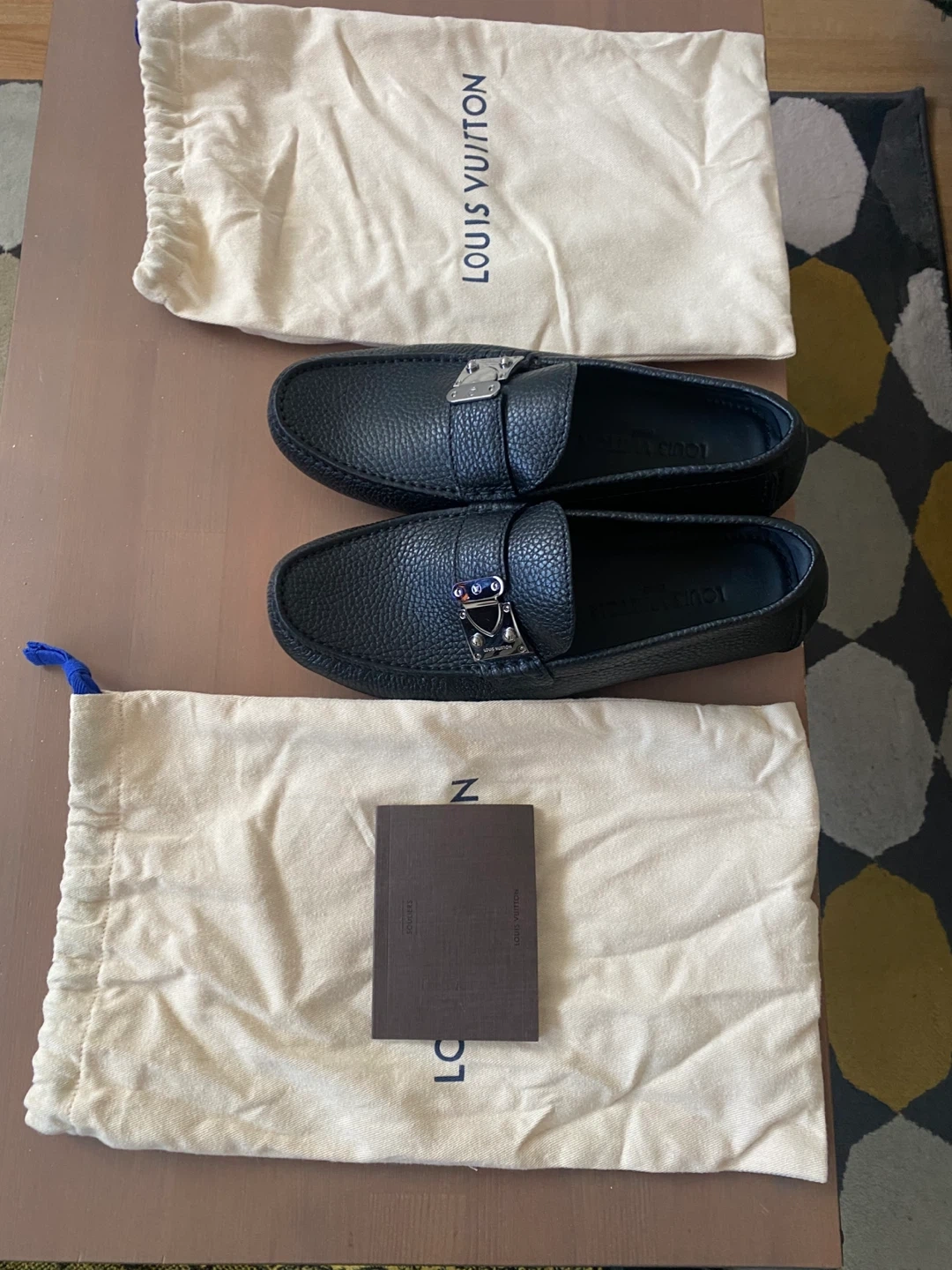 Classic Louis Vuitton loafers in black pebbled leather. Comes with dust bags and original booklet. Comfortable and stylish for any occasion!