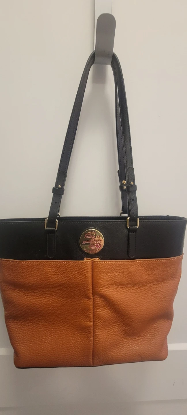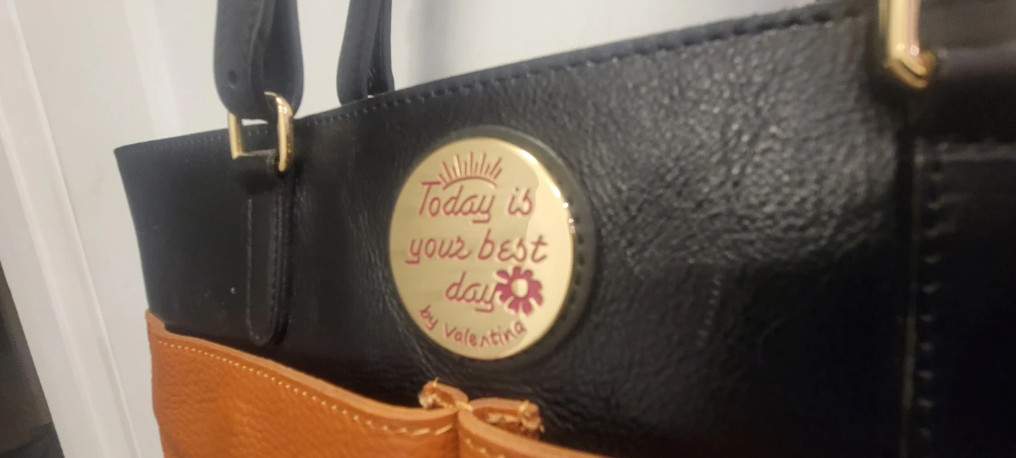 This is a stylish tote bag from Valentina. It features a two-tone design with black and tan leather. The round metal emblem reads "Today is your best day" by Valentina.
