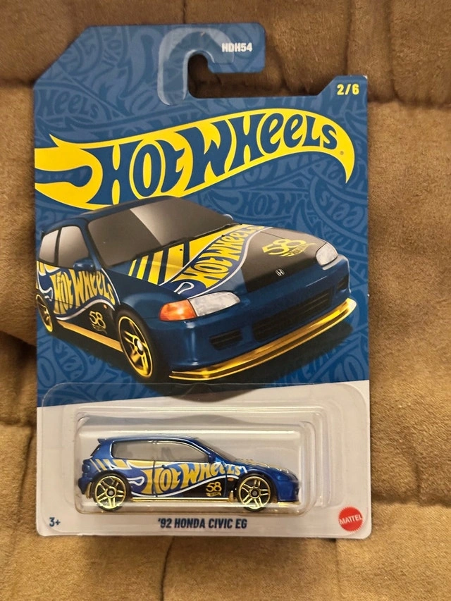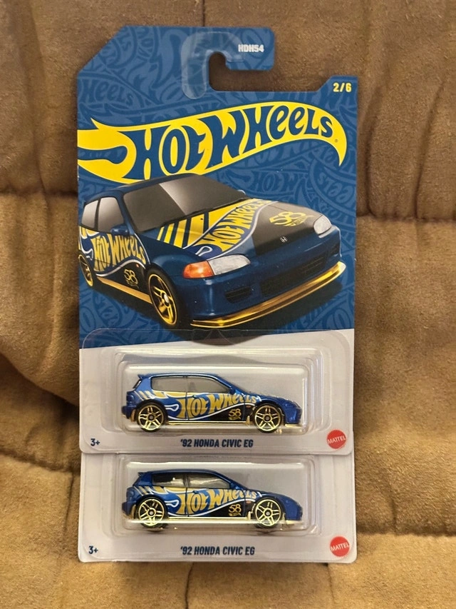 Selling two new Hot Wheels '92 Honda Civic EG diecast cars, still on their original cards. These are 1:64 scale with diecast metal construction and detailed designs. Perfect for collectors or kids who enjoy toy cars. If the ad is up, they're still available.