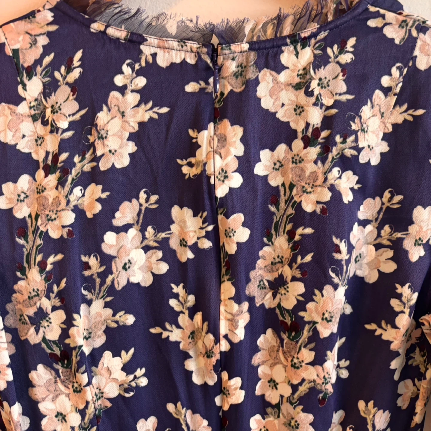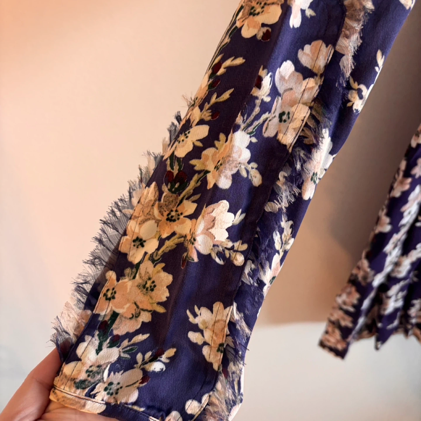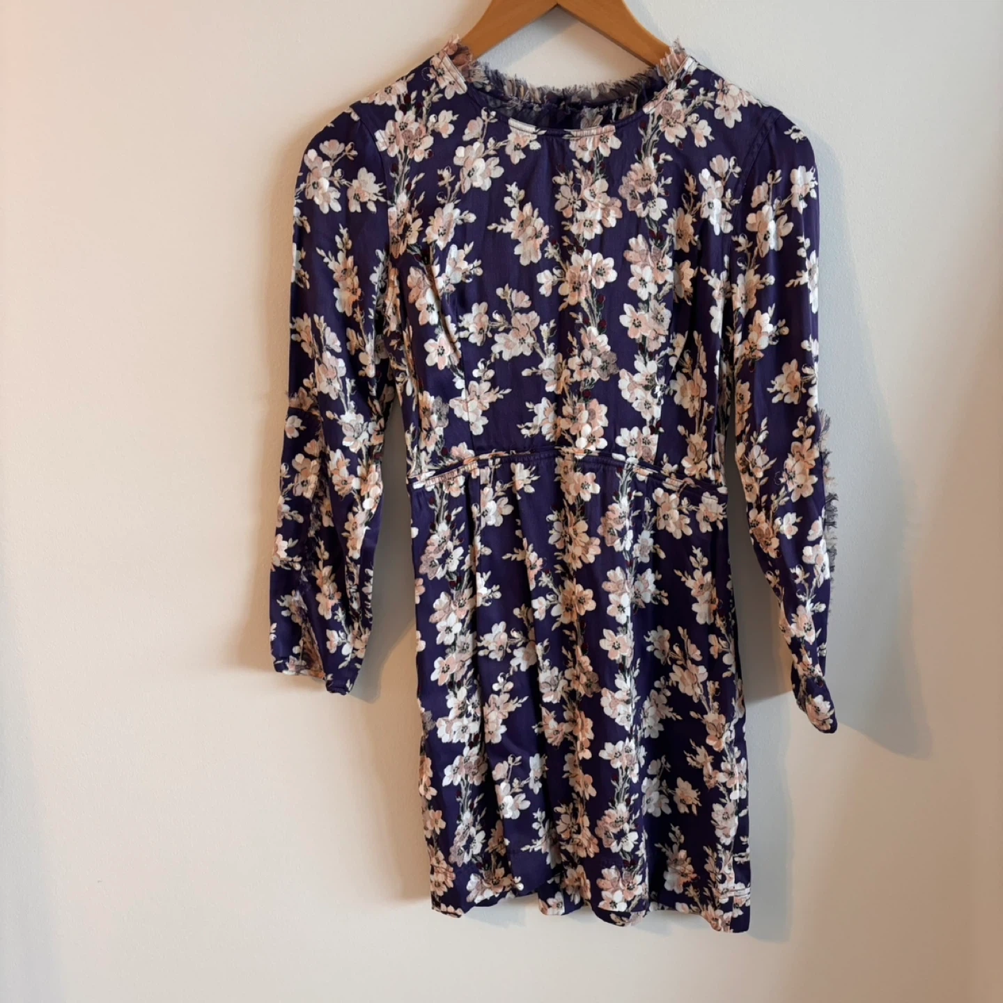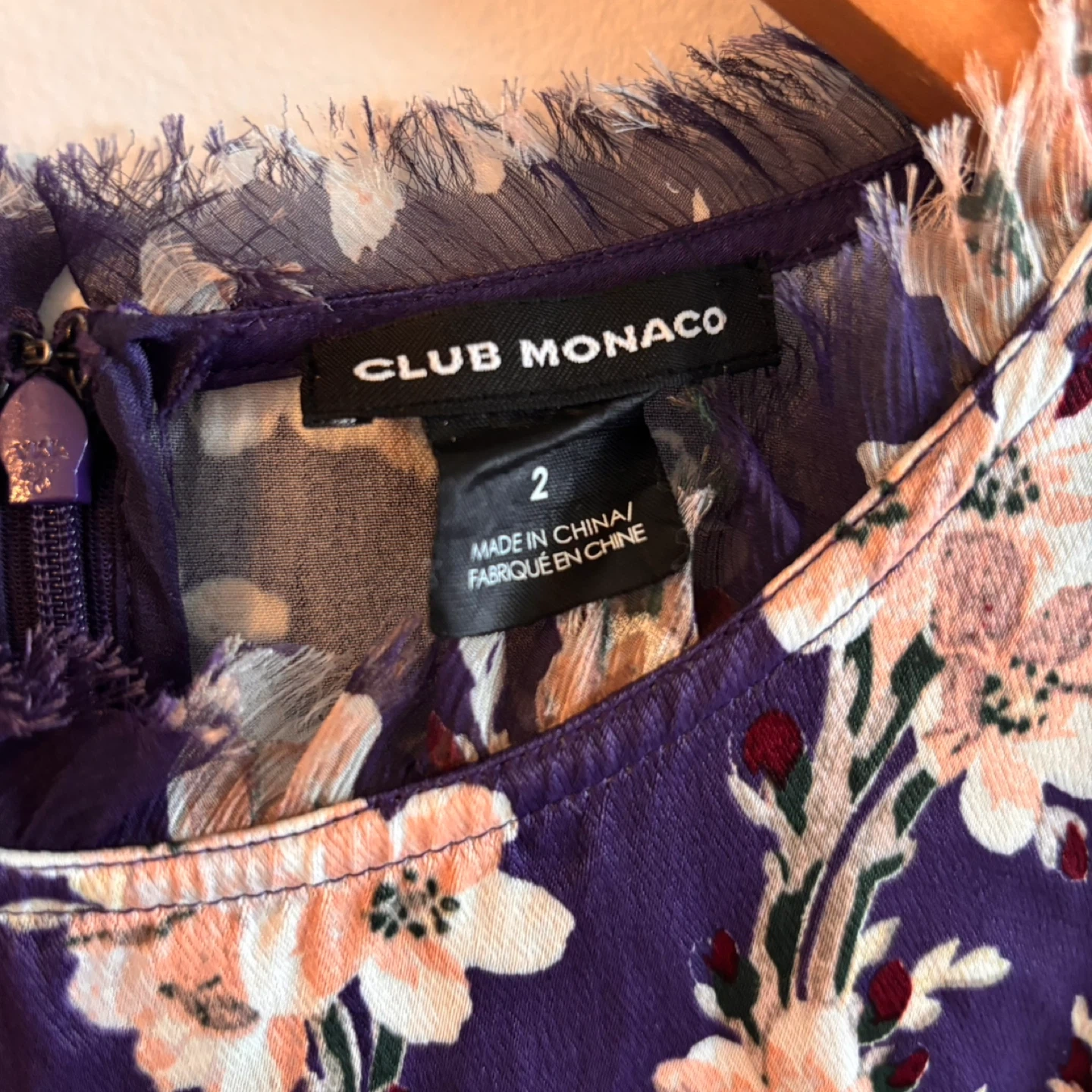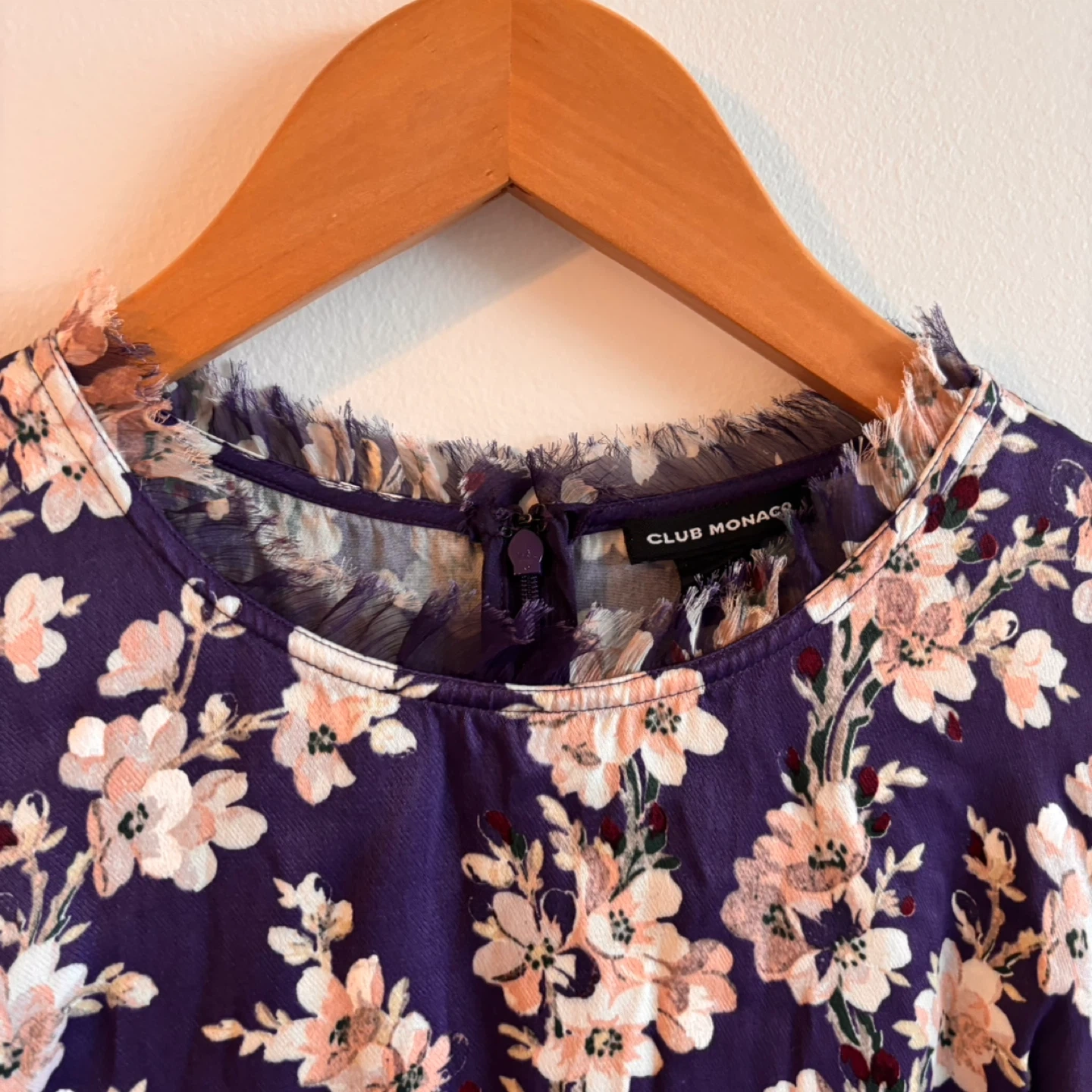 This Club Monaco dress features a lovely purple floral print with a frayed neckline and cuffs. It's a size 2. Perfect for adding a touch of charm to your wardrobe!