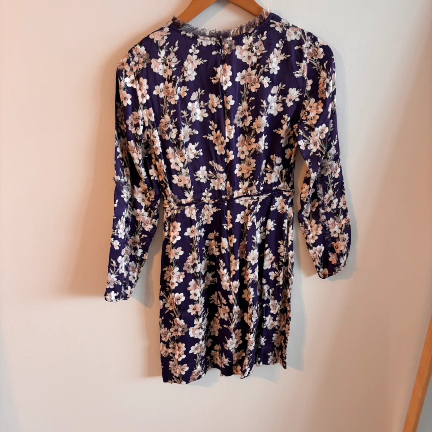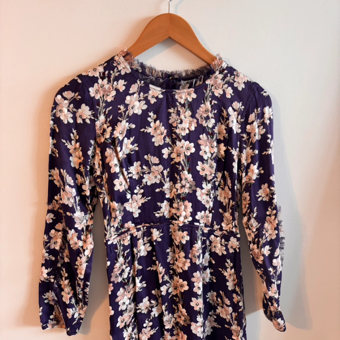 This Club Monaco dress features a lovely purple floral print with a frayed neckline and cuffs. It's a size 2. Perfect for adding a touch of charm to your wardrobe!