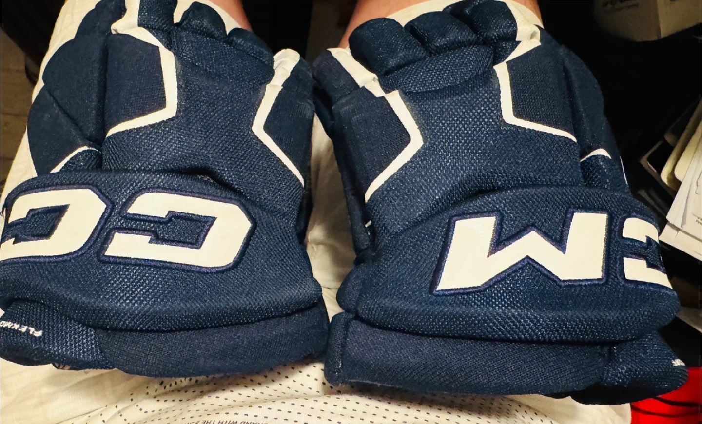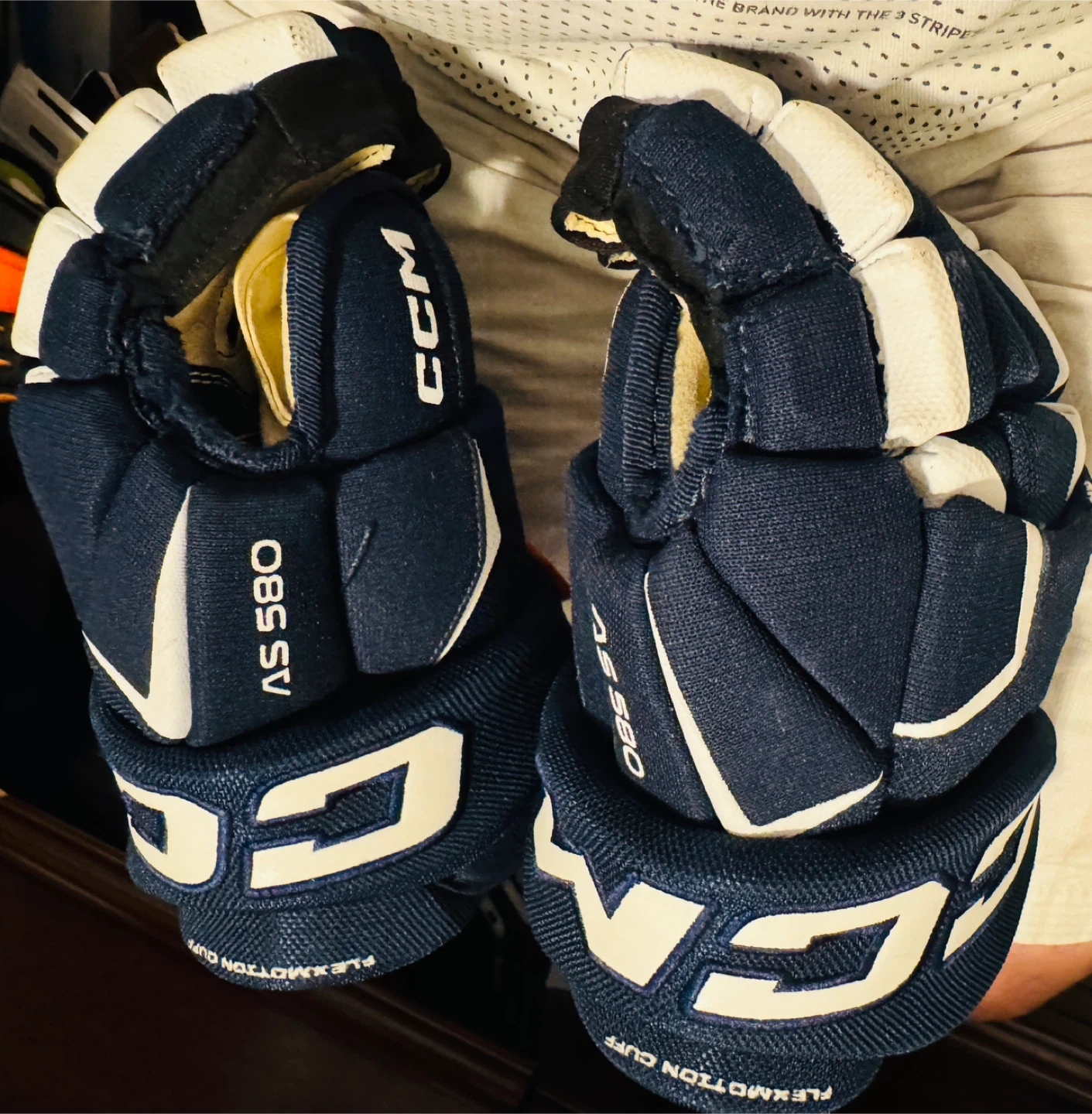 These CCM AS 580 hockey gloves are navy blue and white. They are size 11 inches or 28 cm. These gloves are great for hockey players looking for solid protection and mobility on the ice!