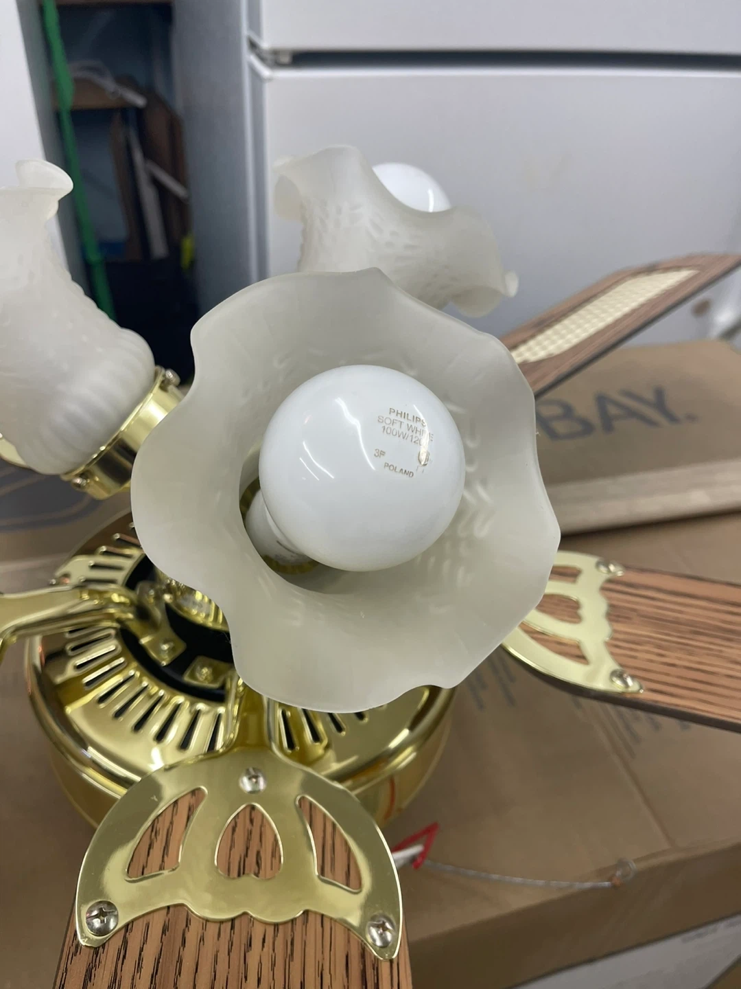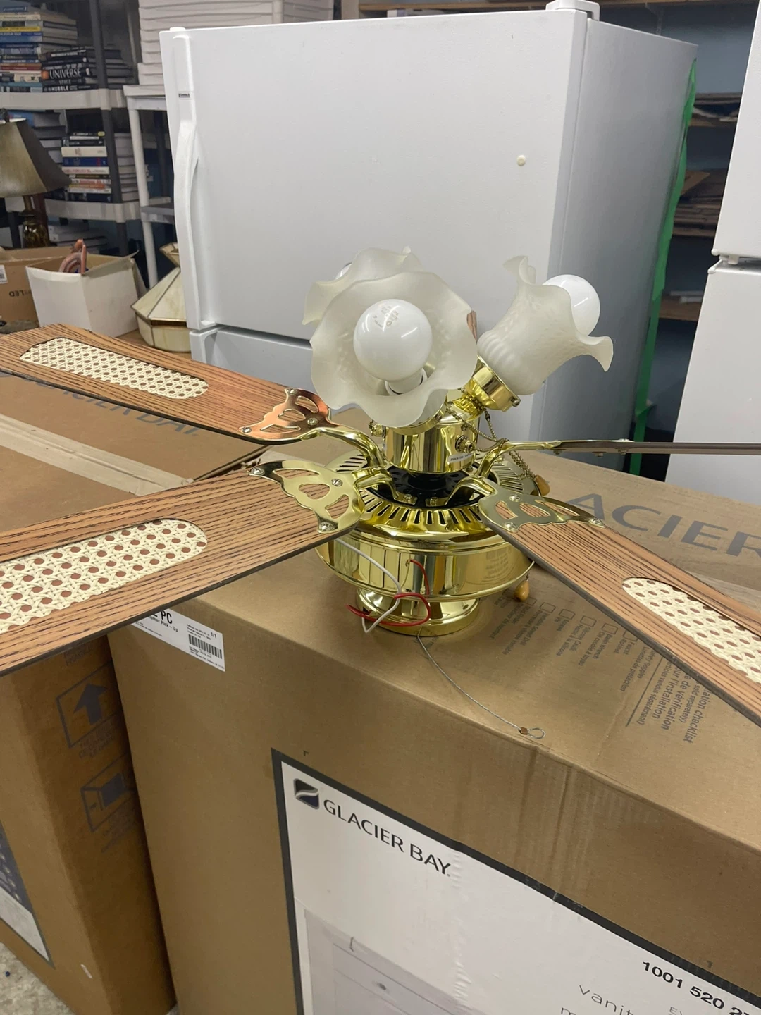 This Glacier Bay ceiling fan features four reversible wood-grain blades and three lights with frosted glass shades. It comes with two light bulbs. 41”Width x 14” Hight. 17” Blades. Cash only