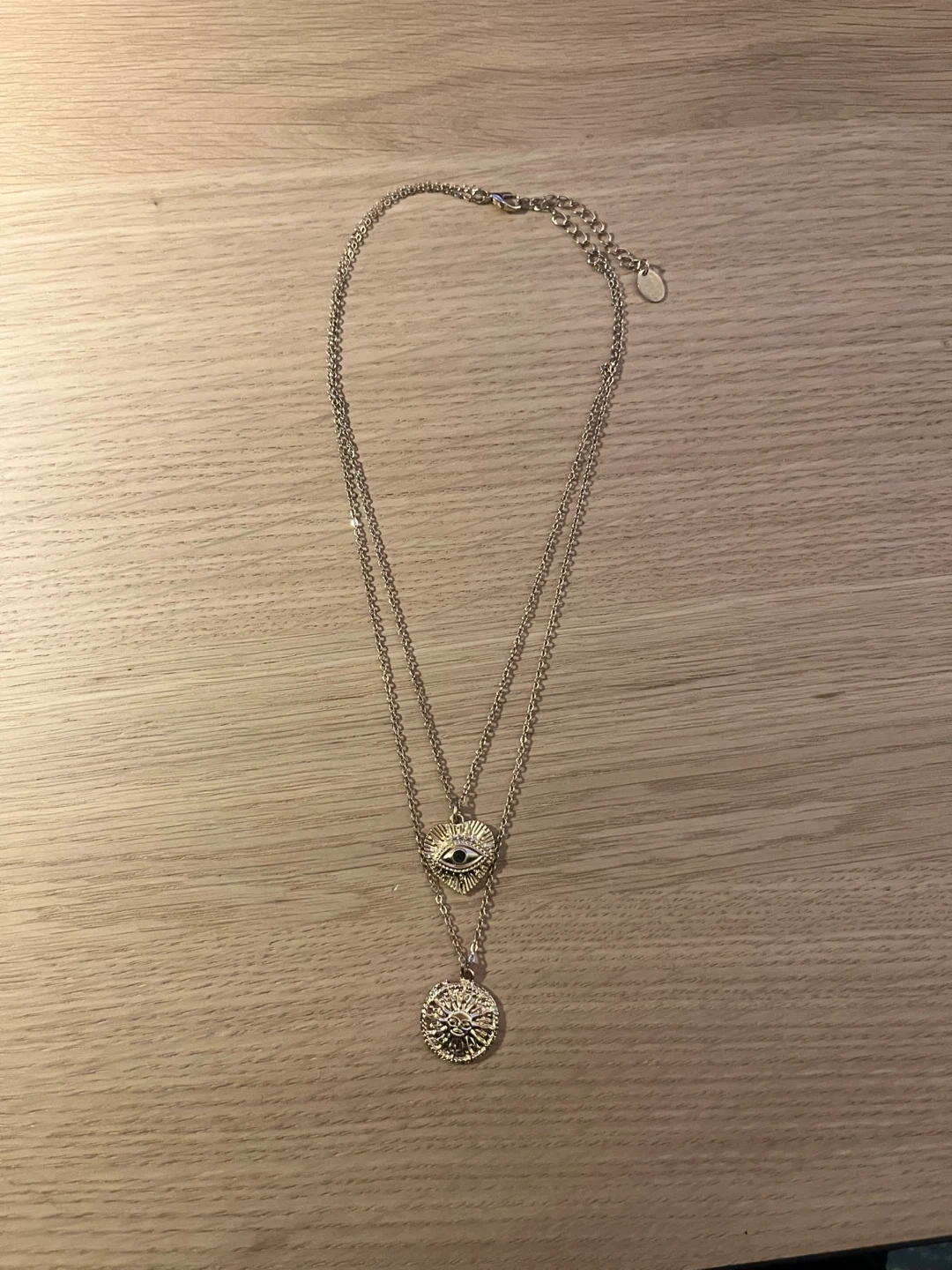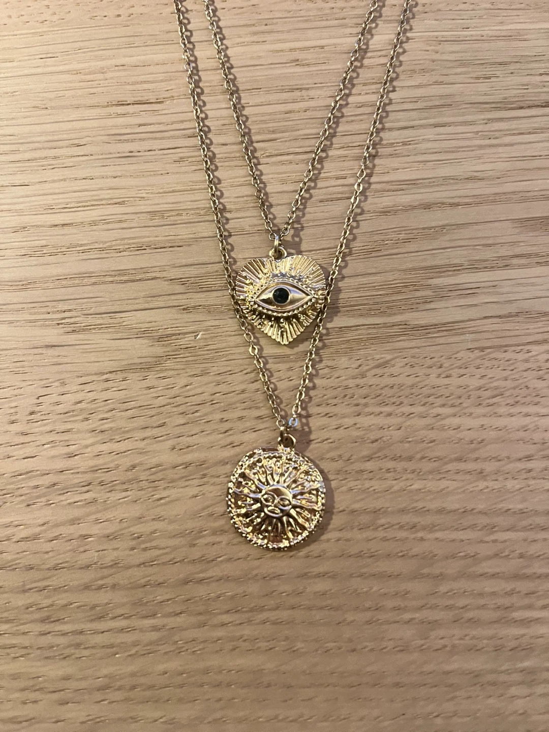 Double layered gold necklace, one chain has a sun charm, and the other has an eye. great condition, never worn! 🌞