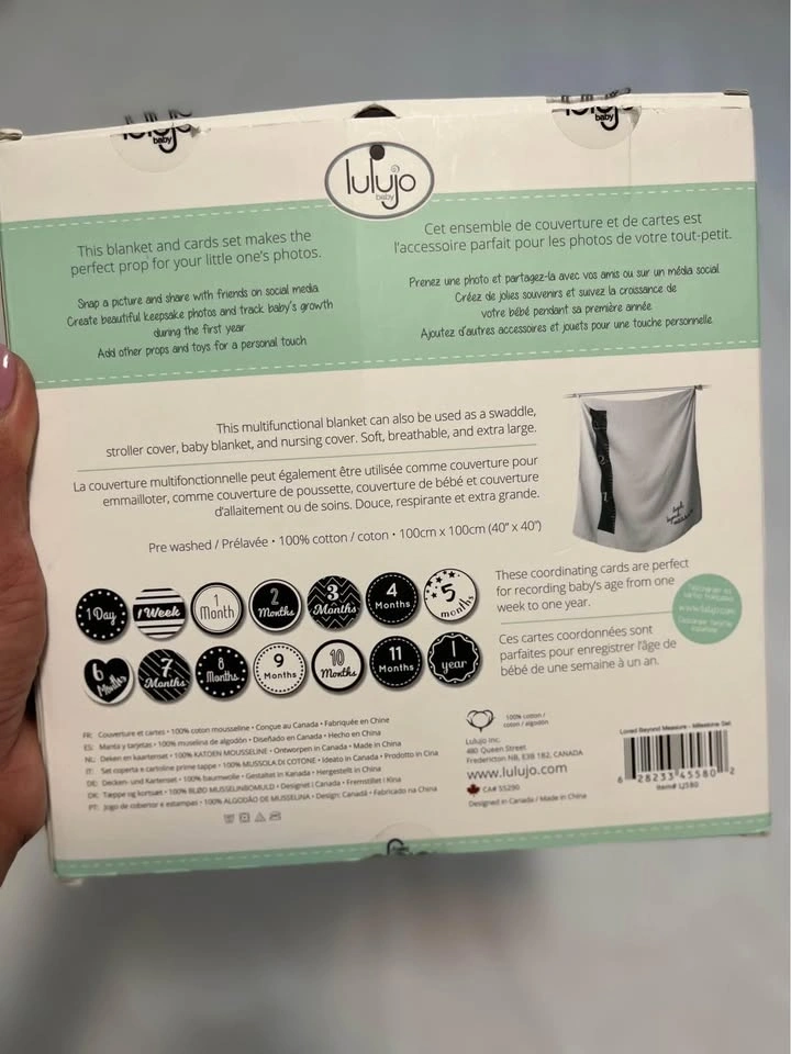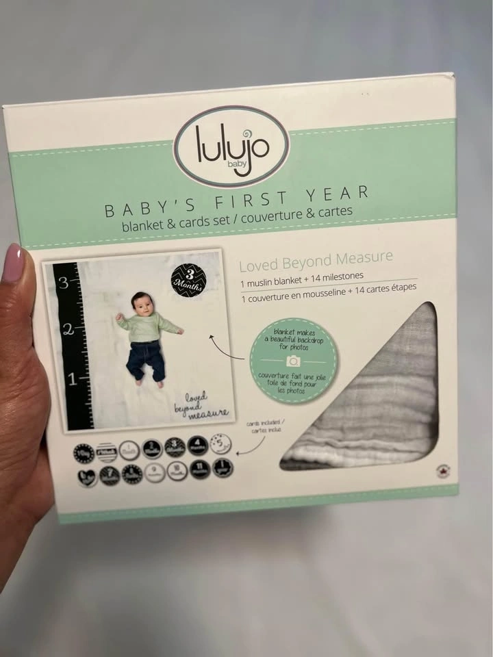 Turn milestones into memories with this large, super soft, premium quality milestone blanket and milestone cards set. Perfect for capturing baby's first months. Includes 1 large muslin blanket and 7 double-sided cards with 14 milestones. Located in Don Mills-Eglinton.