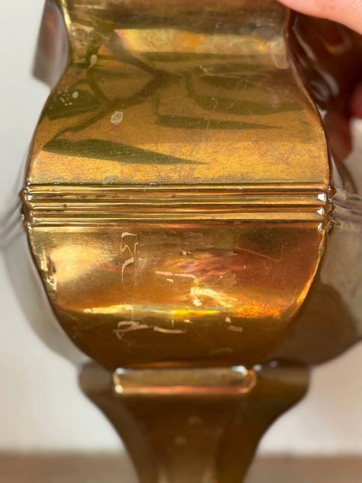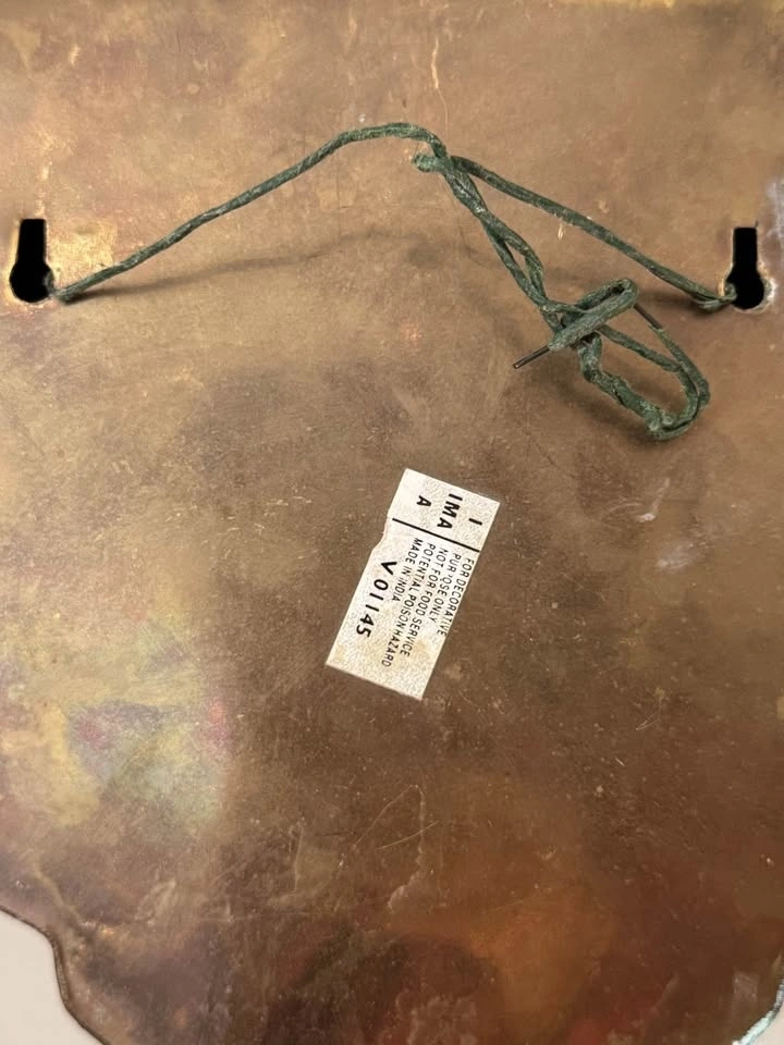 Features a beautiful natural patina and verdigris. Some scratches at the front, please see close-up pictures. You can polish it to a high shine or leave it as-is for an aged look. Has a built-in hanging hole for easy wall mounting.
