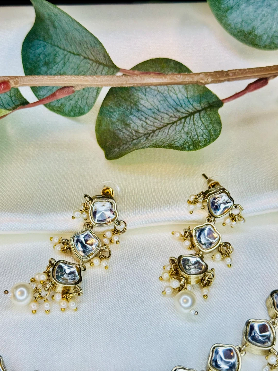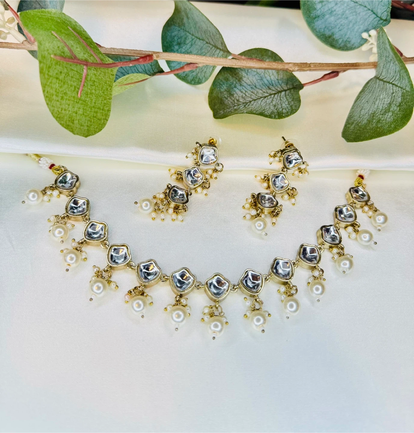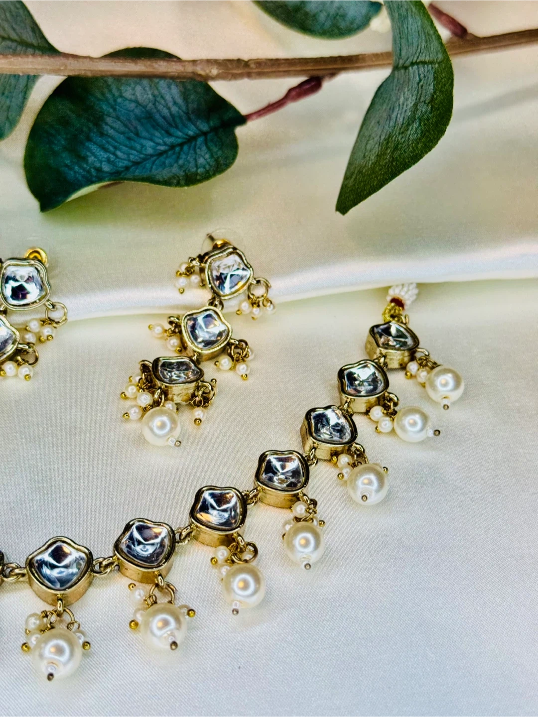 Beautiful Kundan necklace and matching earrings adorned with pearls. This set offers a classic look with intricate detailing. It's perfect for special occasions and celebrations!