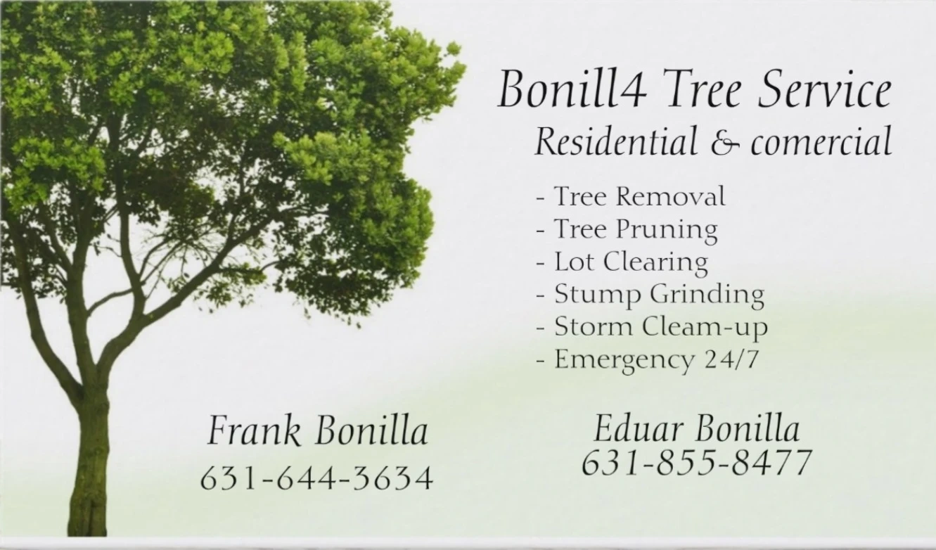Bonill4 Tree Service offers residential & commercial tree services. They provide tree removal, pruning, lot clearing, stump grinding, and emergency storm clean-up 24/7. Frank Bonilla (631-644-3634) and Eduar Bonilla (631-855-8477) are available for your tree care needs. Get professional tree services from experienced arborists!