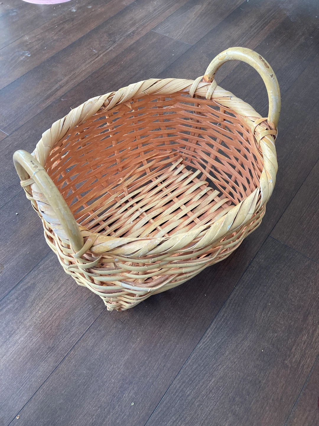 A charming wicker basket, perfect for storage or display. It's made from natural woven material and features two sturdy handles for easy carrying. This basket's rustic design adds a cozy touch to any my hand for scale in second photo.