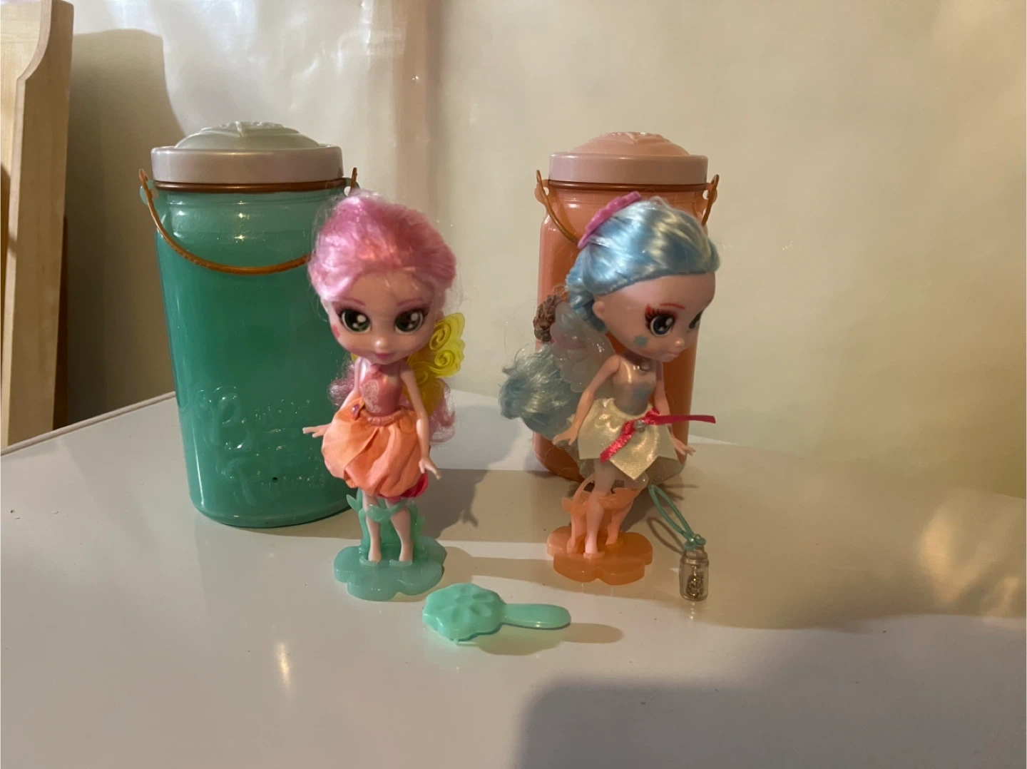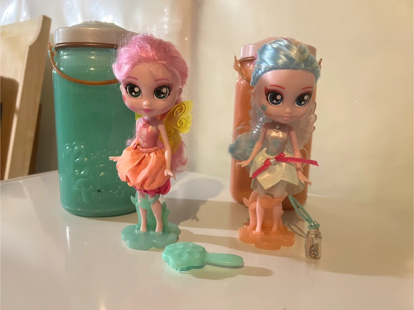 Two collectible fairy dolls, one with pink hair and another with blue hair. They come with stands and accessories. Perfect for imaginative play!