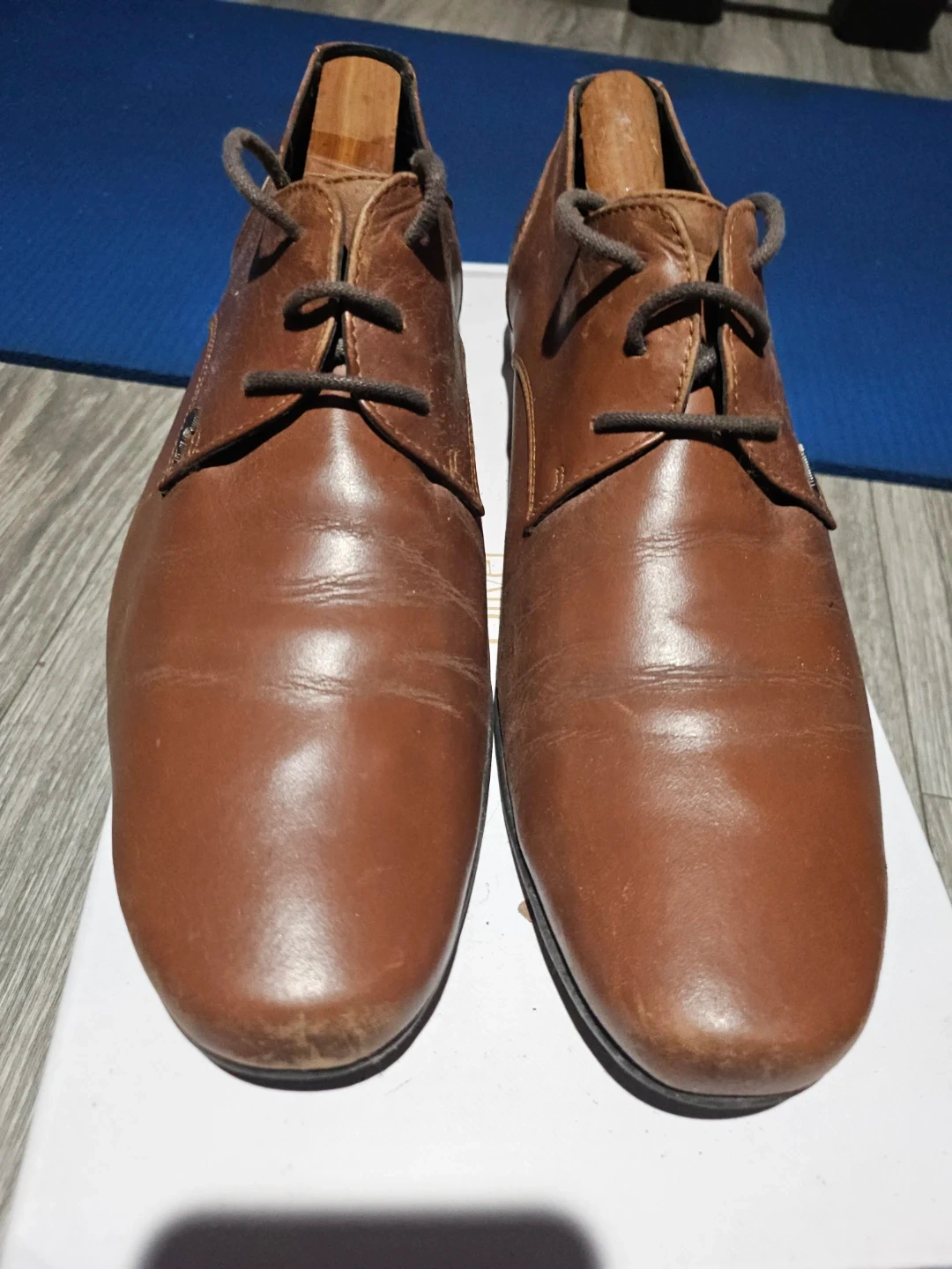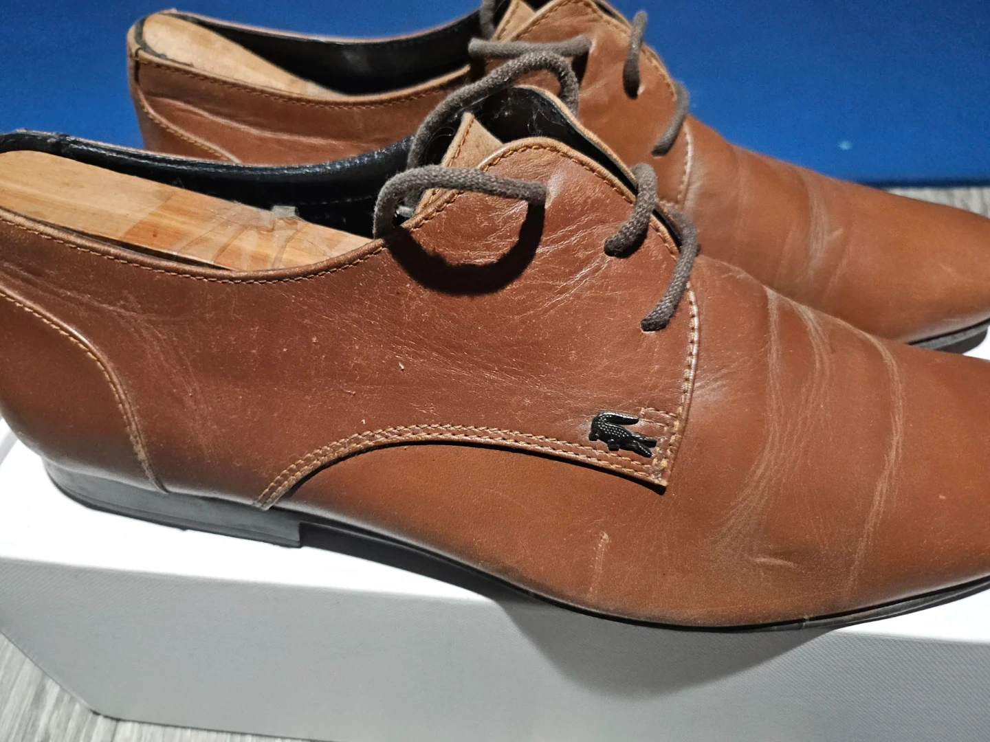 Brown leather dress shoes from Lacoste Paris. Features a classic lace-up design. Includes wooden shoe trees. Leather upper and sole.