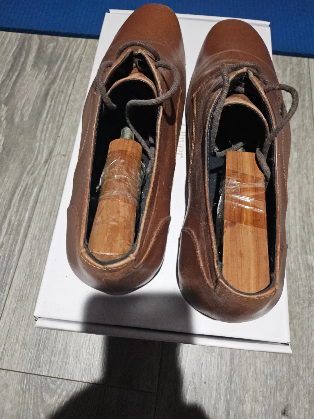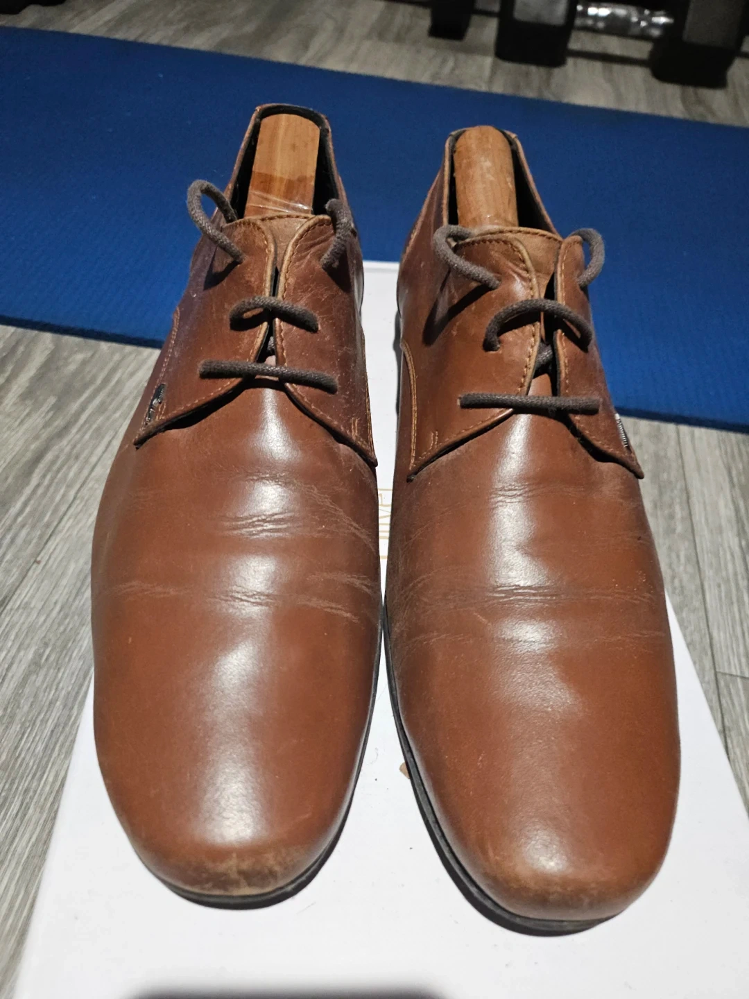 Brown leather dress shoes from Lacoste Paris. Features a classic lace-up design. Includes wooden shoe trees. Leather upper and sole.