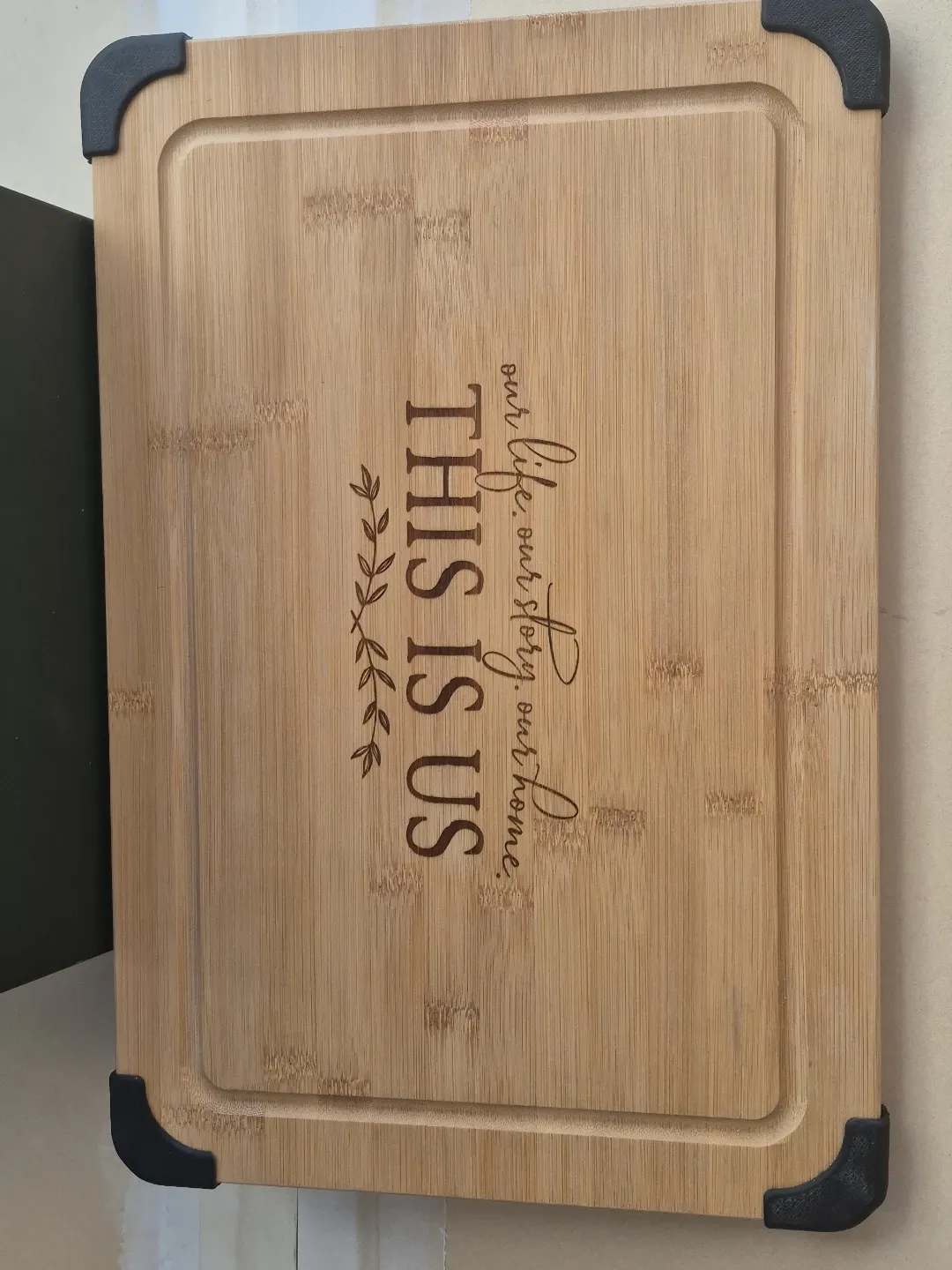 Bamboo cutting board with "This Is Us, our life, our story, our home." engraving. Features rubberized corner grips. Great for food prep or as a decorative kitchen piece! Never used!