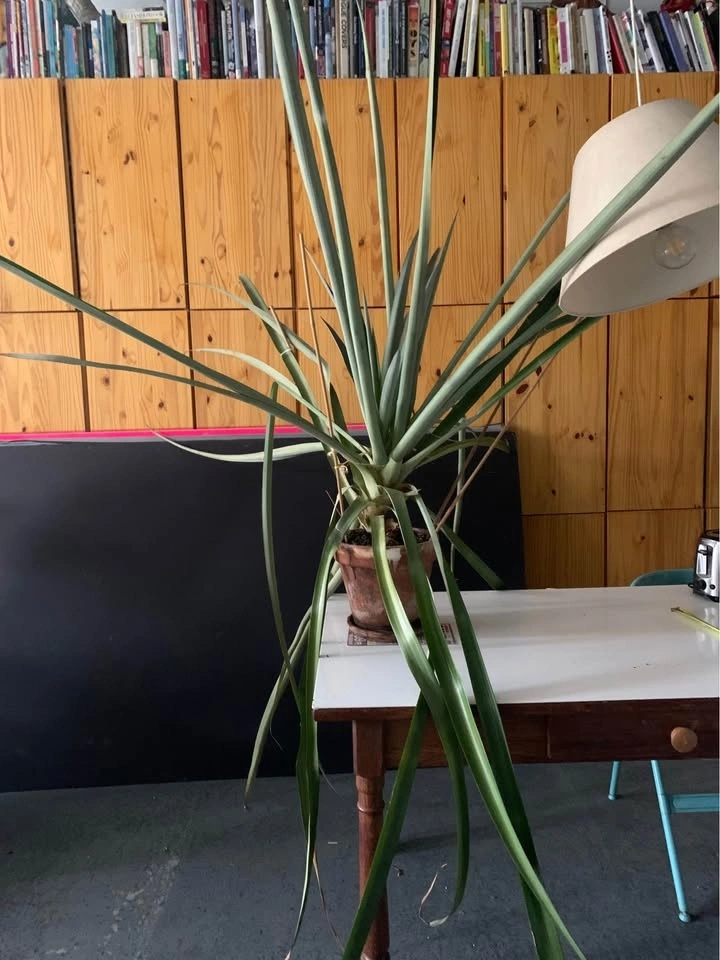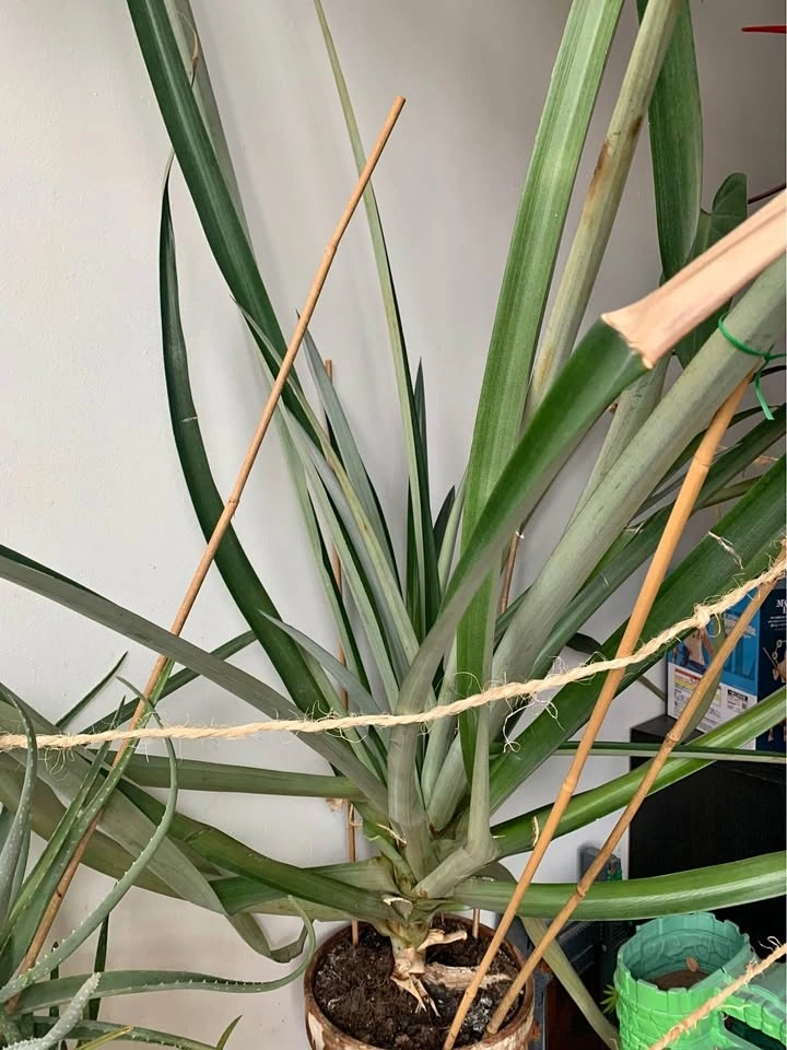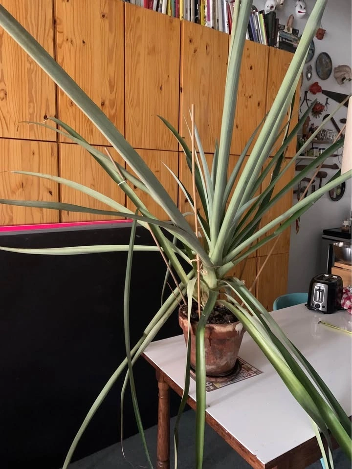 Approximately 64 inches tall x 70 inches when fully spread. This plant needs a trim and would be perfect against a wall for support. It has previously produced 3 pineapples, about one per year. Pick up and cash only.