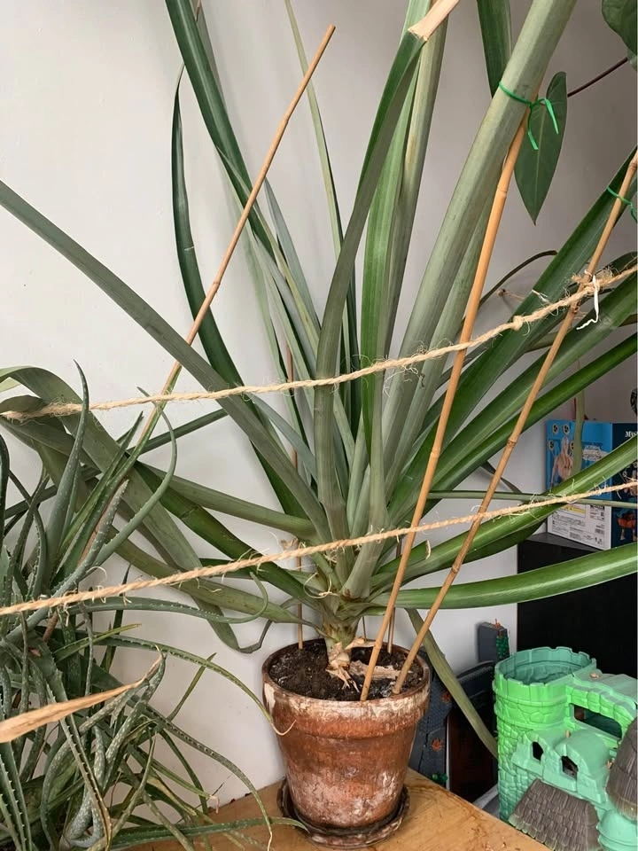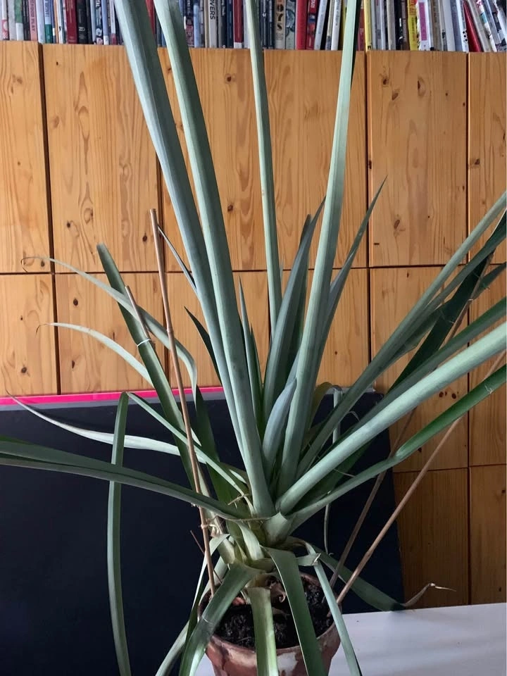 Approximately 64 inches tall x 70 inches when fully spread. This plant needs a trim and would be perfect against a wall for support. It has previously produced 3 pineapples, about one per year. Pick up and cash only.