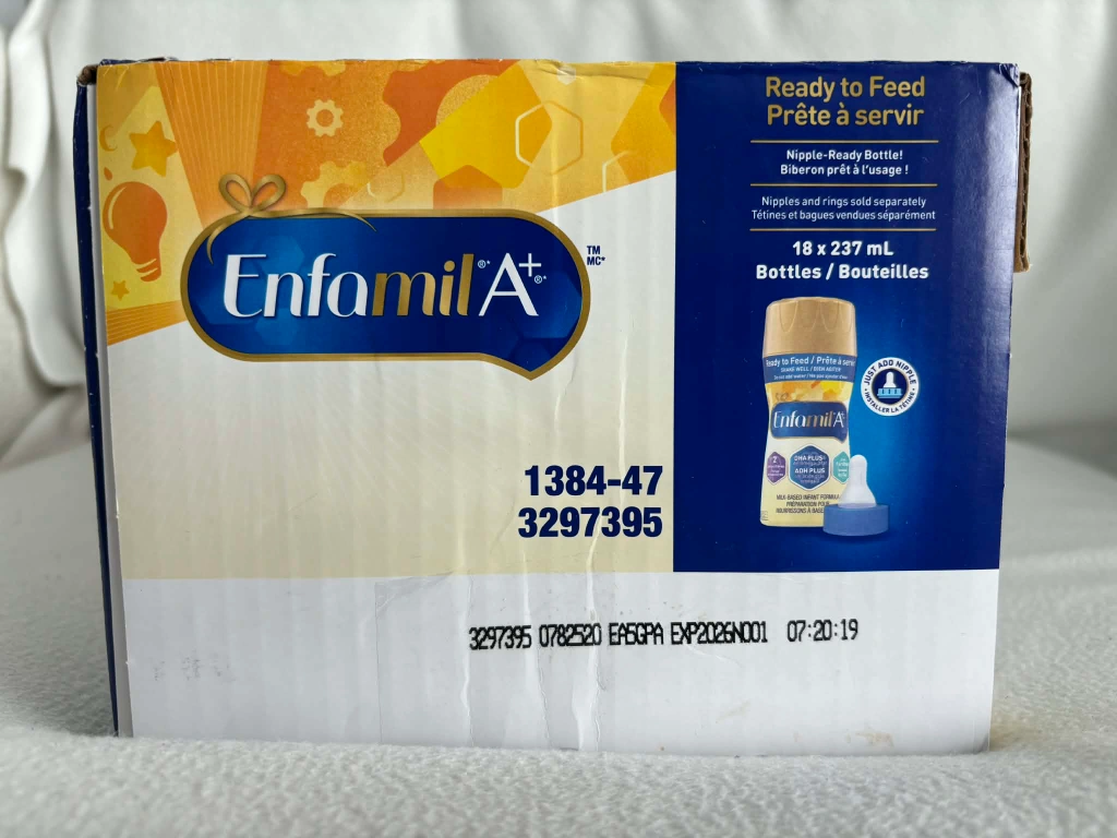 Ready to Feed Enfamil A+ milk-based infant formula in 18 bottles, each 237 mL. Enriched with iron and DHA plus for brain and eye development. Nipple and rings sold separately.