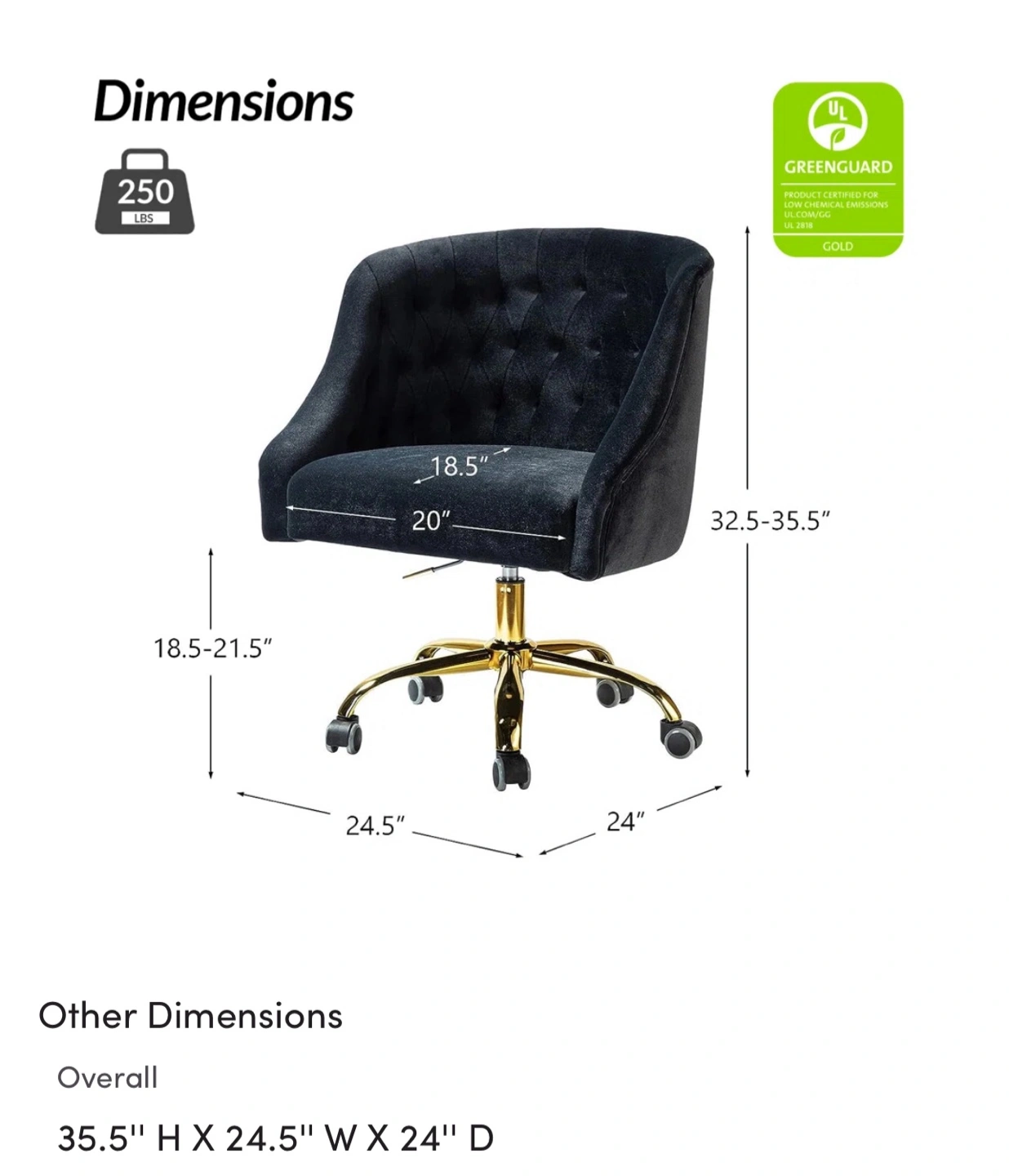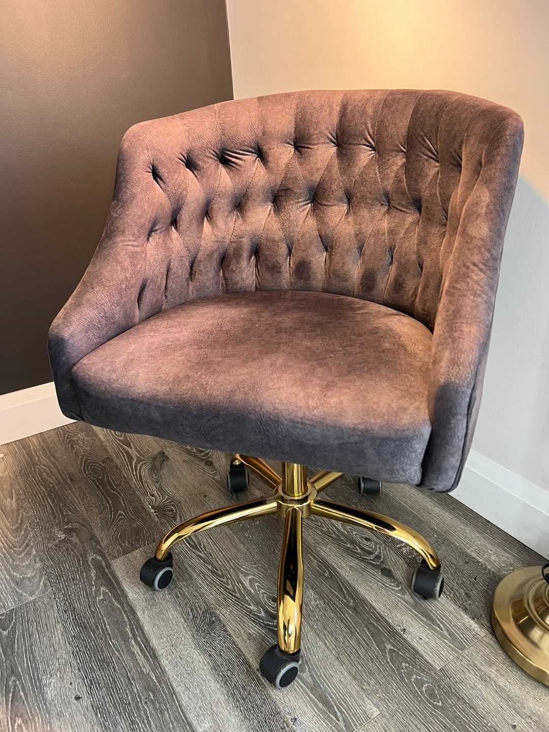 Looking to add a touch of elegance to your workspace? This tufted swivel office chair could be just the thing! It features a soft velvet material in a stylish grey colour with a gold base.