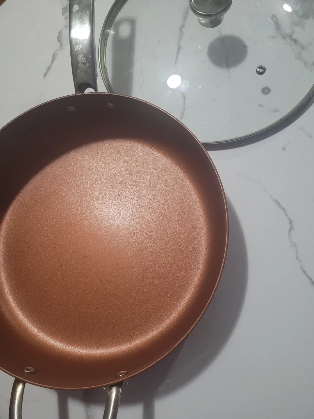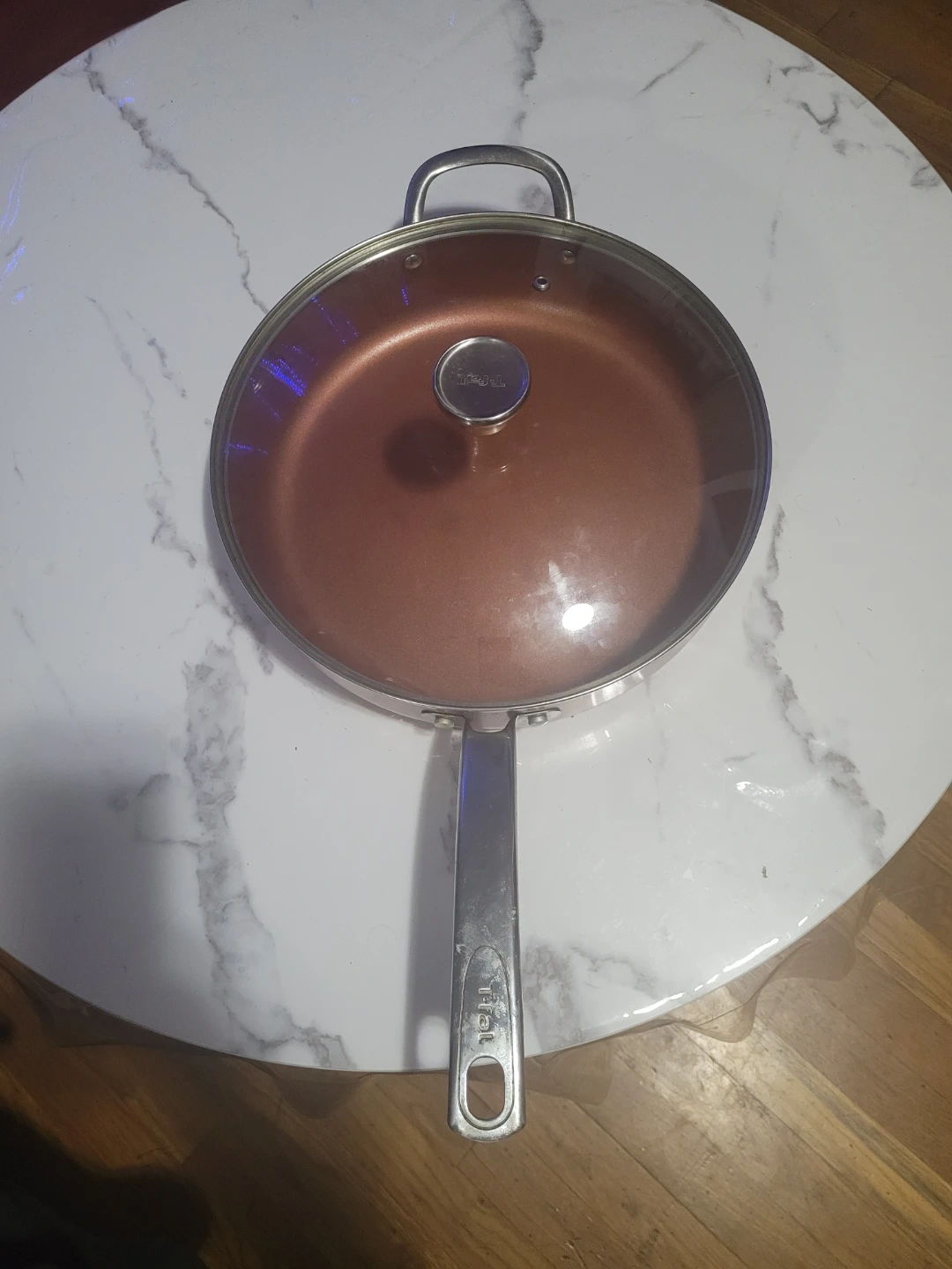Selling a copper-colored frying pan that comes with a lid. It's in great condition and ready for a new kitchen! The pan has a nonstick surface, making it easy to cook and clean. Perfect for everyday cooking!