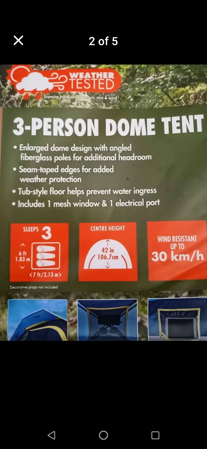This 3-person dome tent features enlarged dome design with angled fiberglass poles for additional headroom. It has seam-taped edges for added weather protection and a tub-style floor to help prevent water ingress. The tent includes 1 mesh window and 1 electrical port.