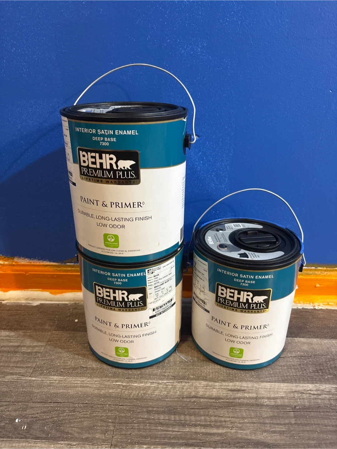 This is BEHR PREMIUM PLUS interior satin enamel paint and primer. It's a deep base color and comes in a low odor, durable, long-lasting finish. Each can is 1 gallon.