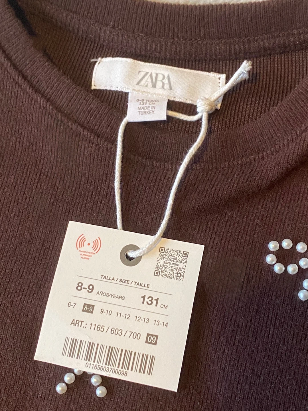 Zara girls' long-sleeve brown fine-knit sweater and matching skort. The top is embellished with faux pearl bows.