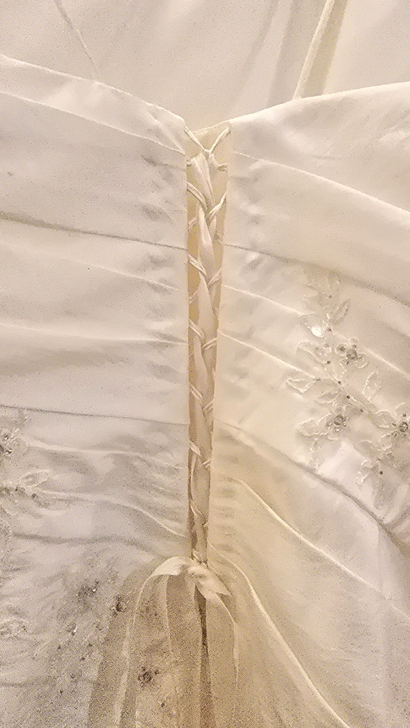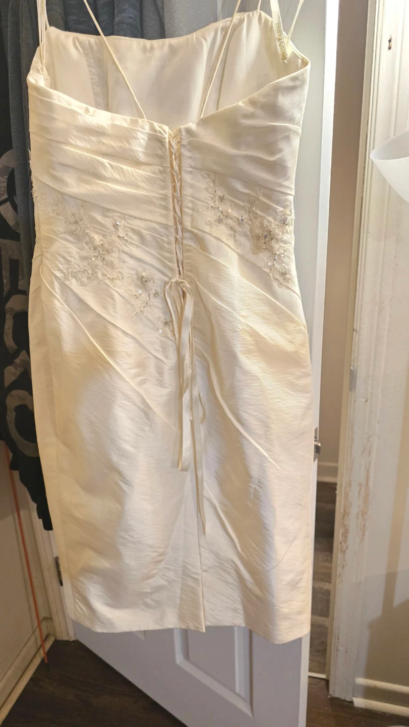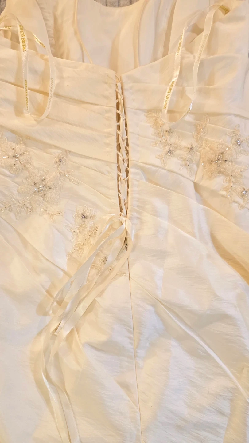 ✨️David's Bridal dress in a beautiful ivory colour. It has some lovely detailing with the beading and corset back✨️