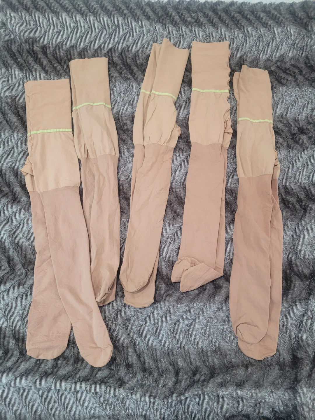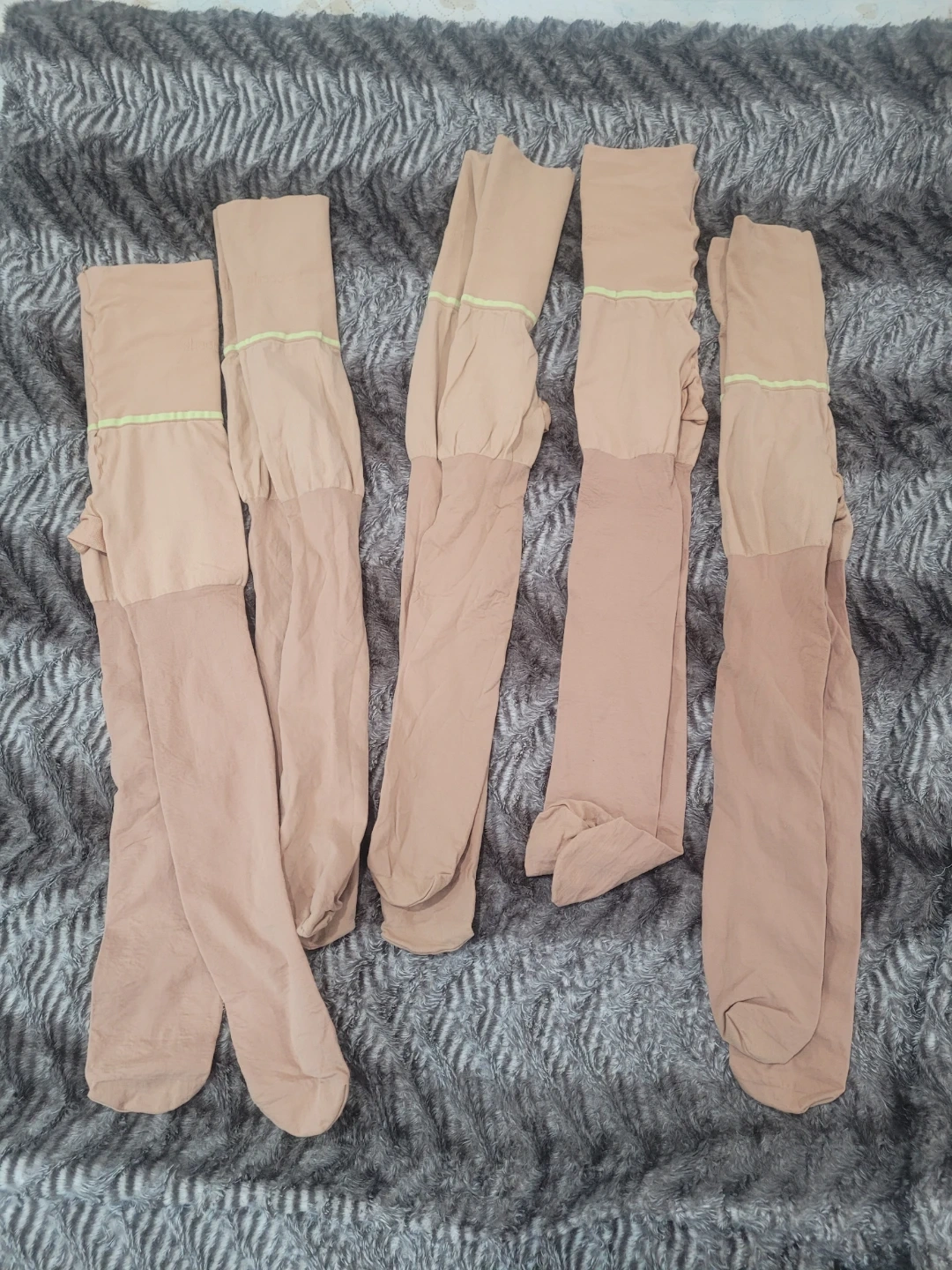 Five pairs of nude pantyhose, each with a reinforced toe and a light green band at the top. These stockings are made of a nylon blend. They're suitable for everyday wear or special occasions.