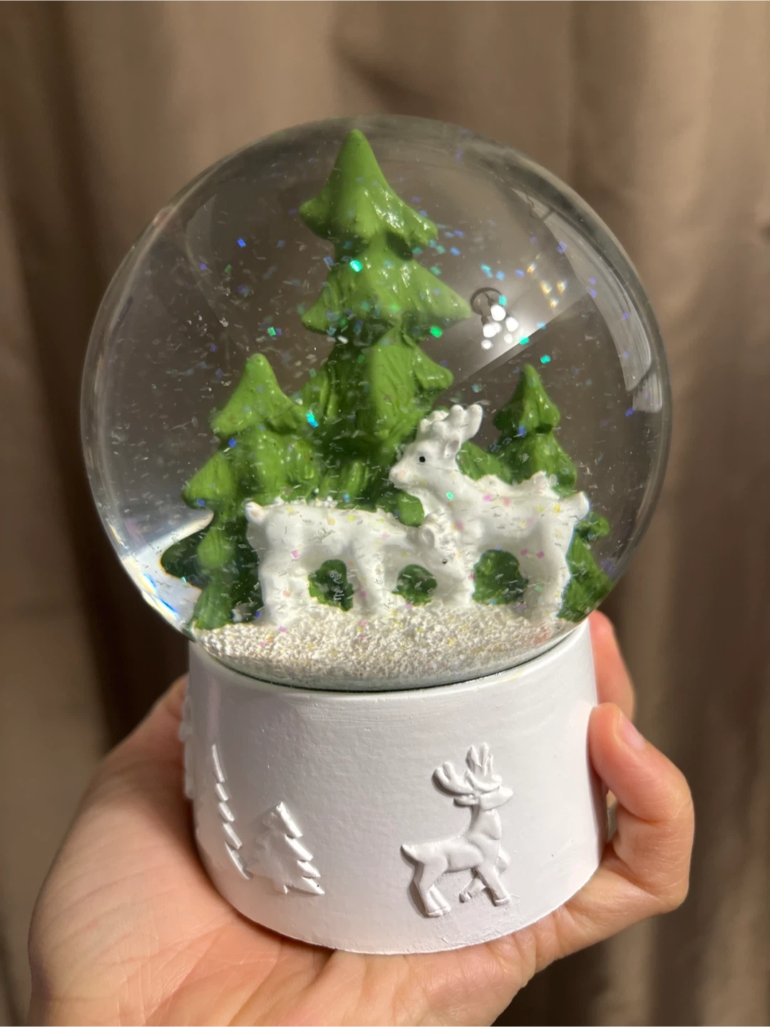 This festive snow globe features a charming Christmas scene with green trees and white reindeer. When shaken, it's filled with sparkling glitter. The white base has embossed wintery designs. Perfect for adding a touch of holiday cheer to your home! Porch pickup.