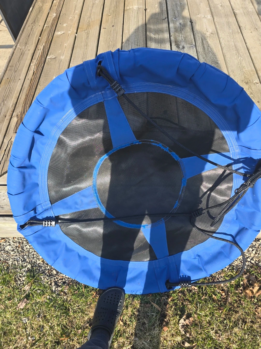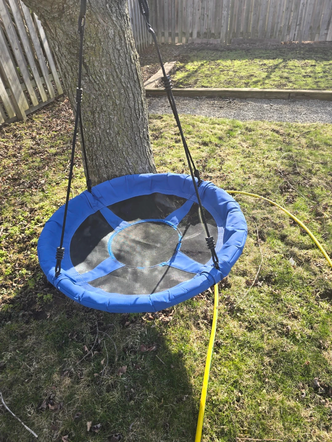 This blue disc swing is ready for backyard fun! It's made with durable fabric and mesh for comfort and airflow. Includes strong rope hangers for secure attachment. Great for kids' outdoor playtime!