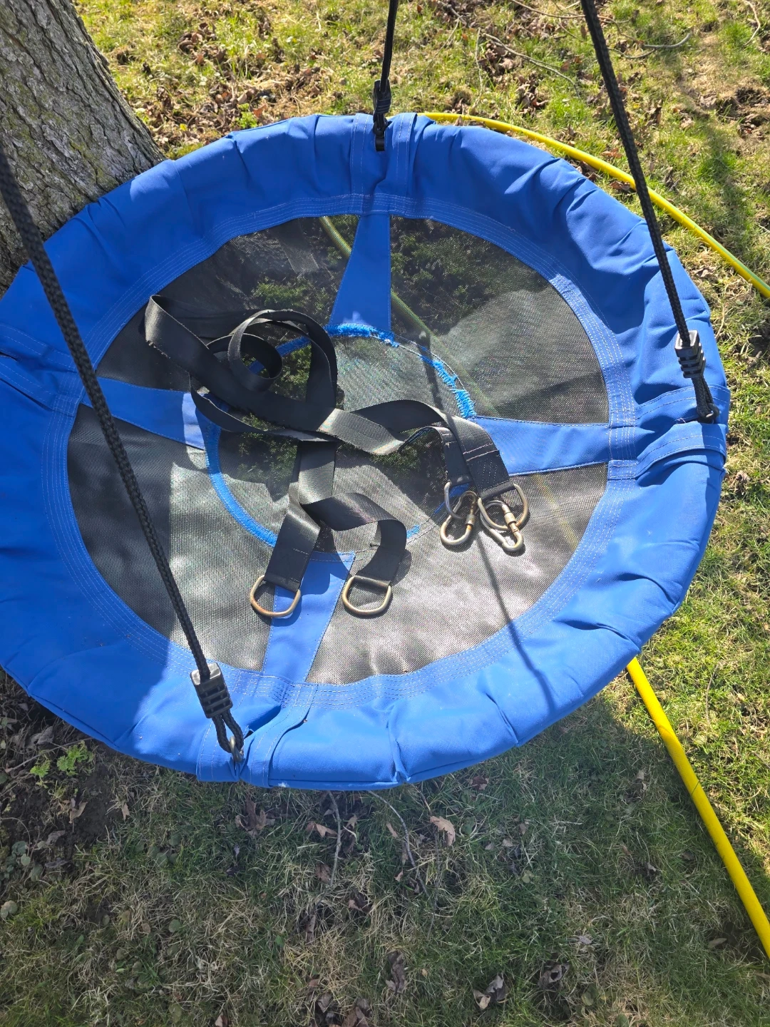This blue disc swing is ready for backyard fun! It's made with durable fabric and mesh for comfort and airflow. Includes strong rope hangers for secure attachment. Great for kids' outdoor playtime!