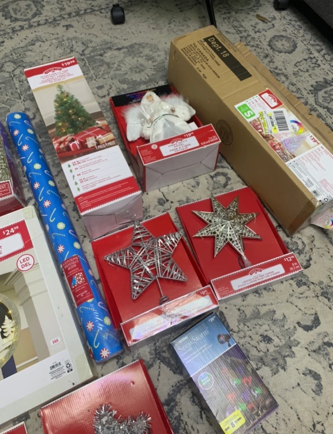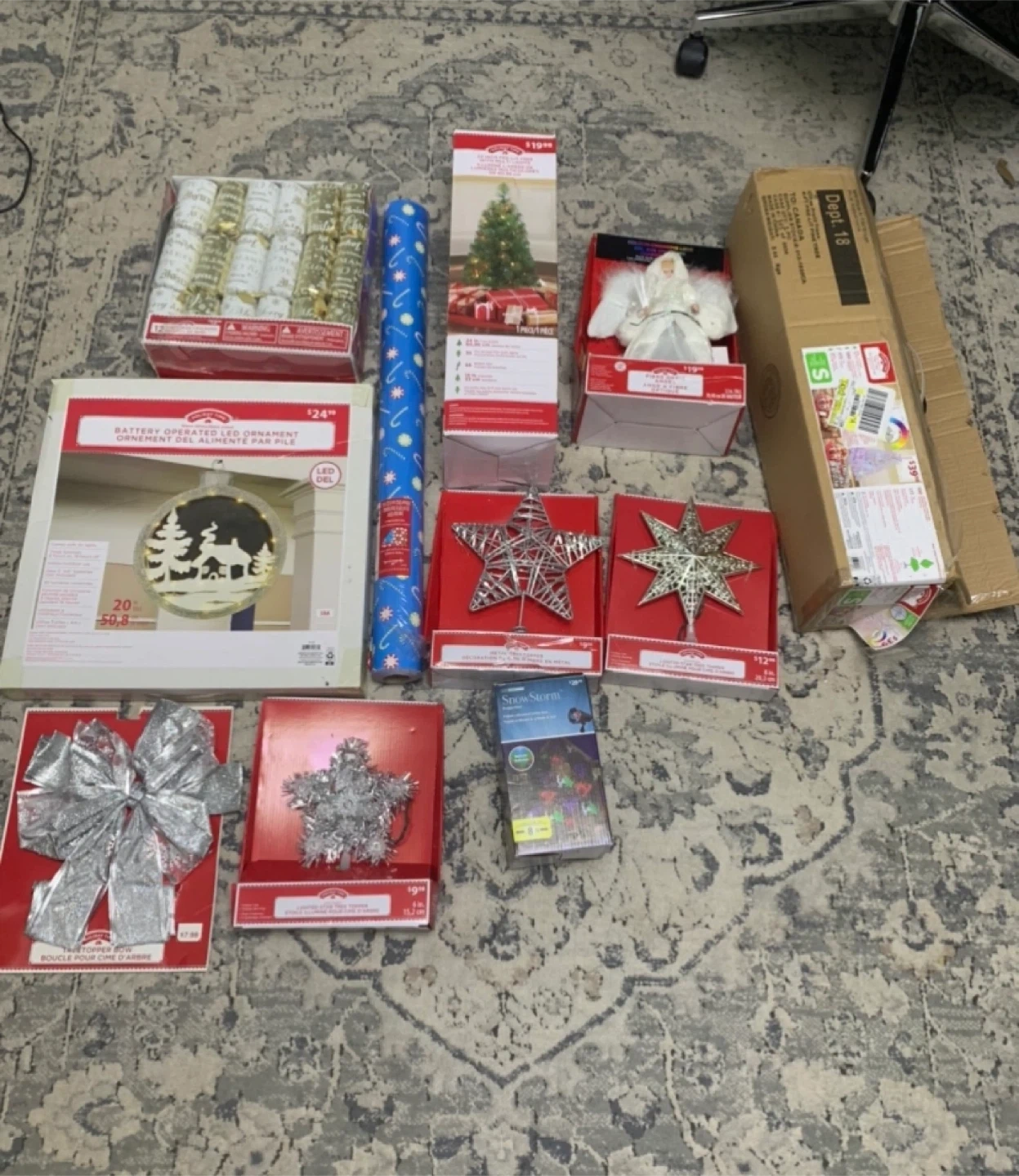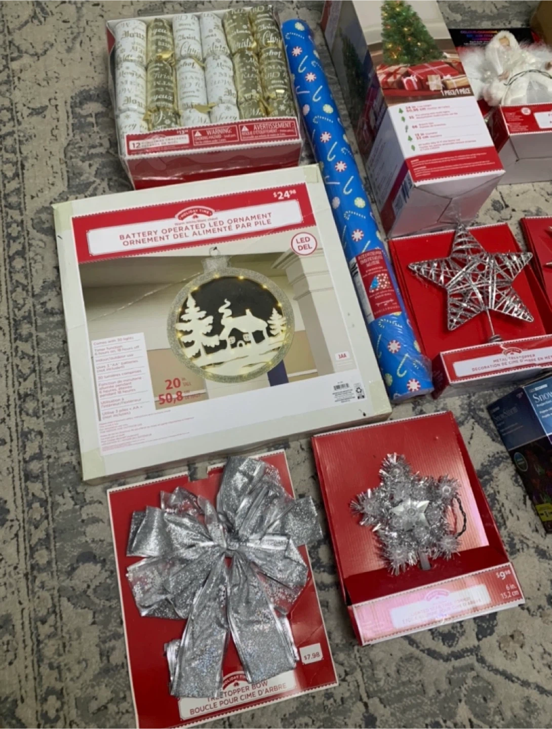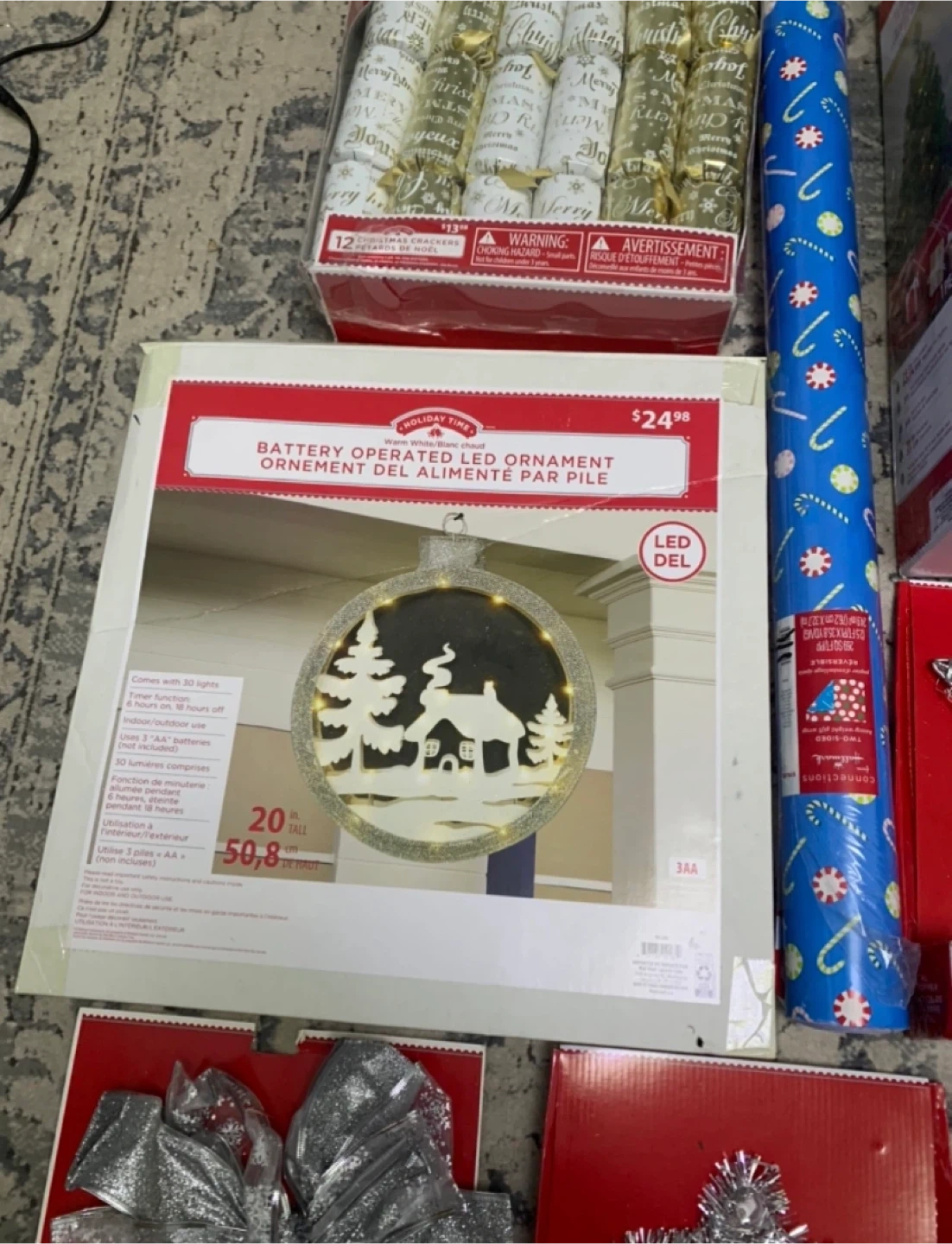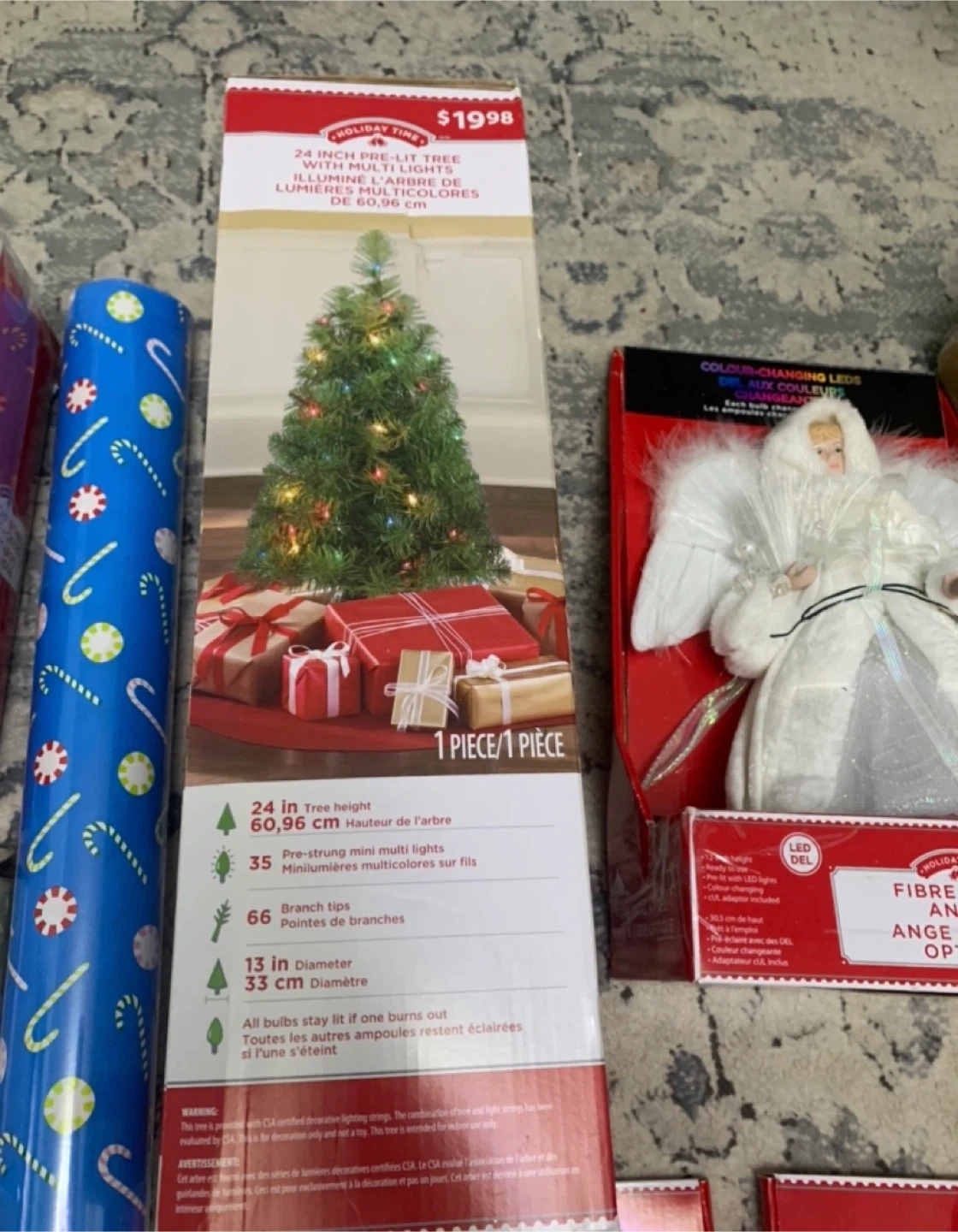 Selling a few holiday decorations, including a Holiday Time battery-operated LED ornament and a 24-inch Holiday Time tree with multi-lights! Also included are some star tree toppers and wrapping paper. All items are still in their original packaging