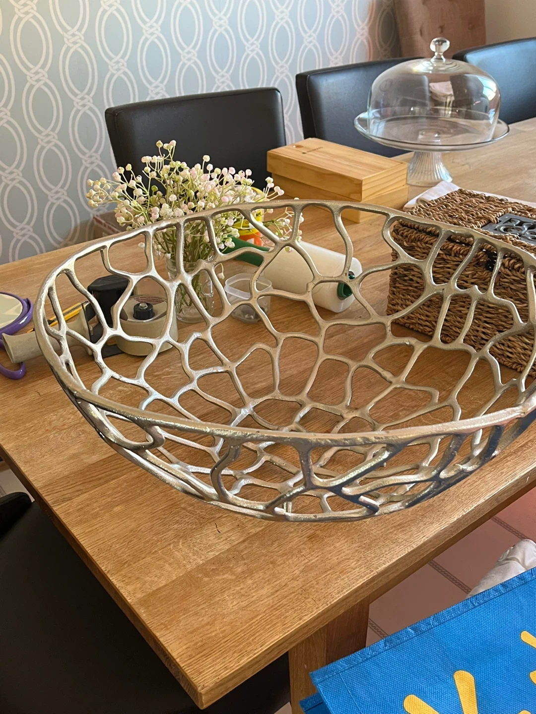 This decorative metal bowl features an intricate, organic-inspired openwork design. It's perfect for holding fruit or as a stylish centrepiece on your table. The metallic finish adds a touch of modern elegance to any room.