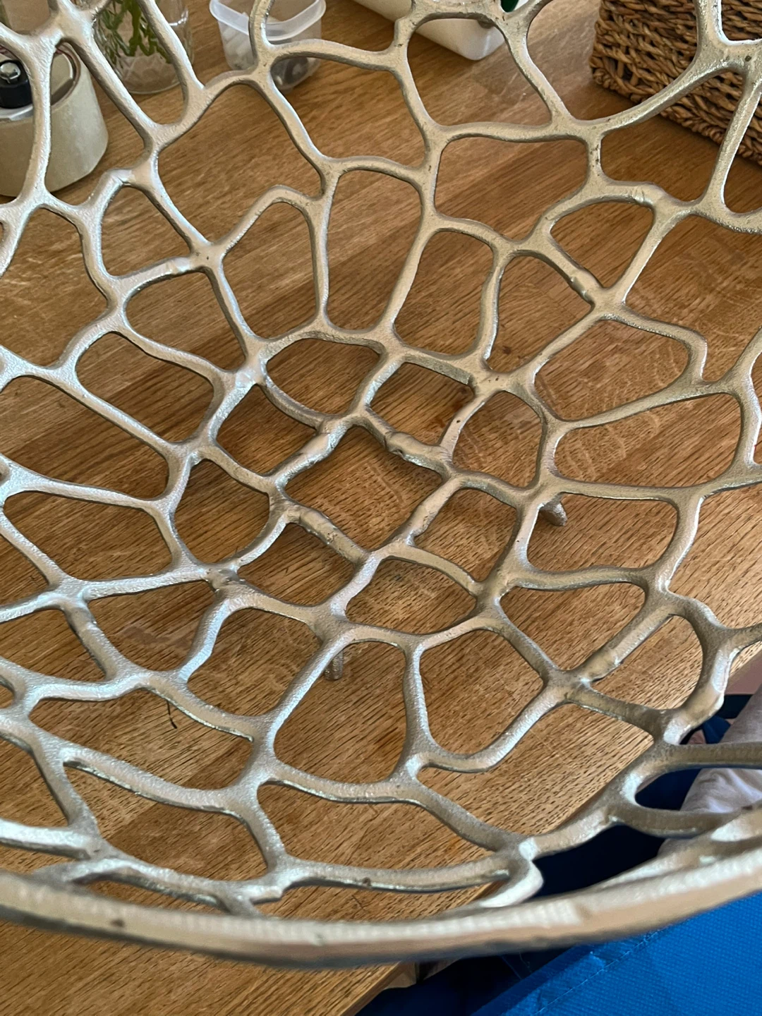 This decorative metal bowl features an intricate, organic-inspired openwork design. It's perfect for holding fruit or as a stylish centrepiece on your table. The metallic finish adds a touch of modern elegance to any room.