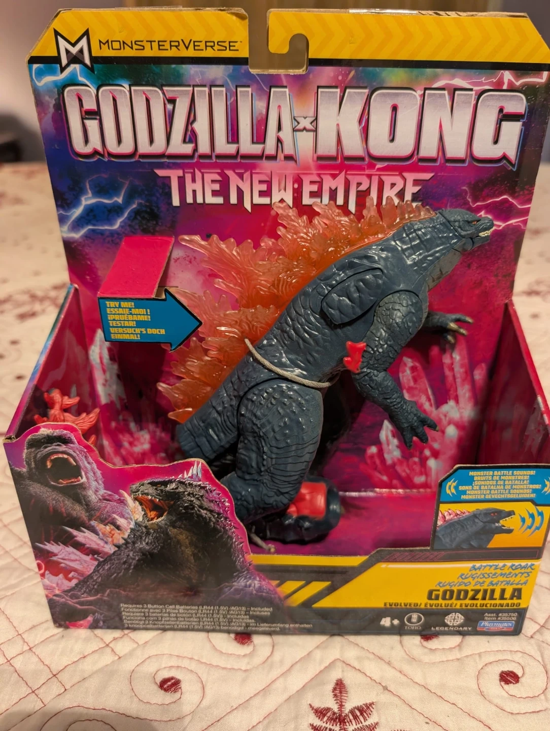 Selling a Godzilla vs Kong: The New Empire action figure from the Monsterverse series! This evolved Godzilla figure has battle roar sounds and requires 3 button cell batteries (LR44 1.5V) which are included. It's made by Playmates and is part of the Toho Legendary collection. The box is included!