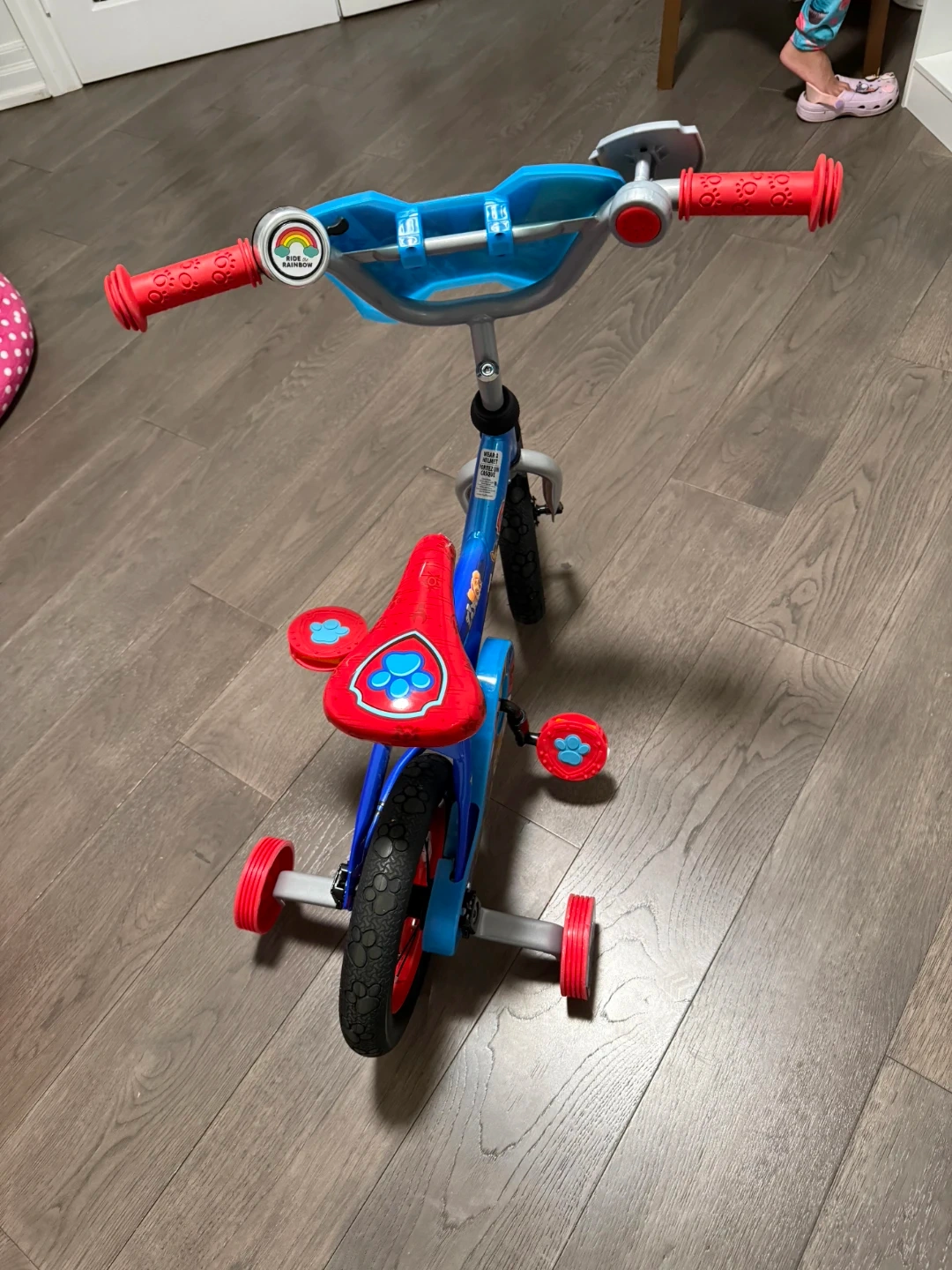 This Paw Patrol tricycle is designed for toddlers and features a fun blue and red colour scheme. It has sturdy wheels and comfortable handlebars for easy riding. It's perfect for little ones just learning to ride!