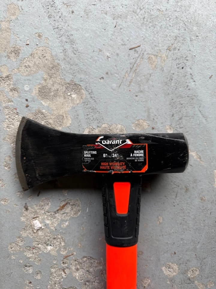 Selling a Garant 6 lb Splitting Maul in excellent condition. Purchased less than a year ago and only used a handful of times. Head: 6 lb forged and hardened steel—holds an edge well and has a wide flare for efficient splitting. Handle: 34-inch high-visibility orange fiberglass. Much more durable than wood and very easy to spot in the brush or woodpile. Grip: Non-slip thermoplastic rubber (TPR) with an ergonomic flared end. Safety: Features integrated overstrike protection to prevent handle damage if you miss a swing. Perfect for splitting firewood or logs. Only selling because I am downsizing.