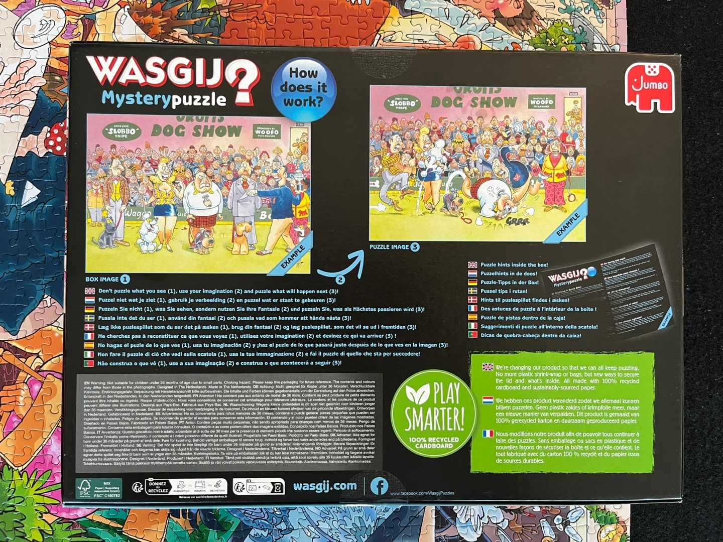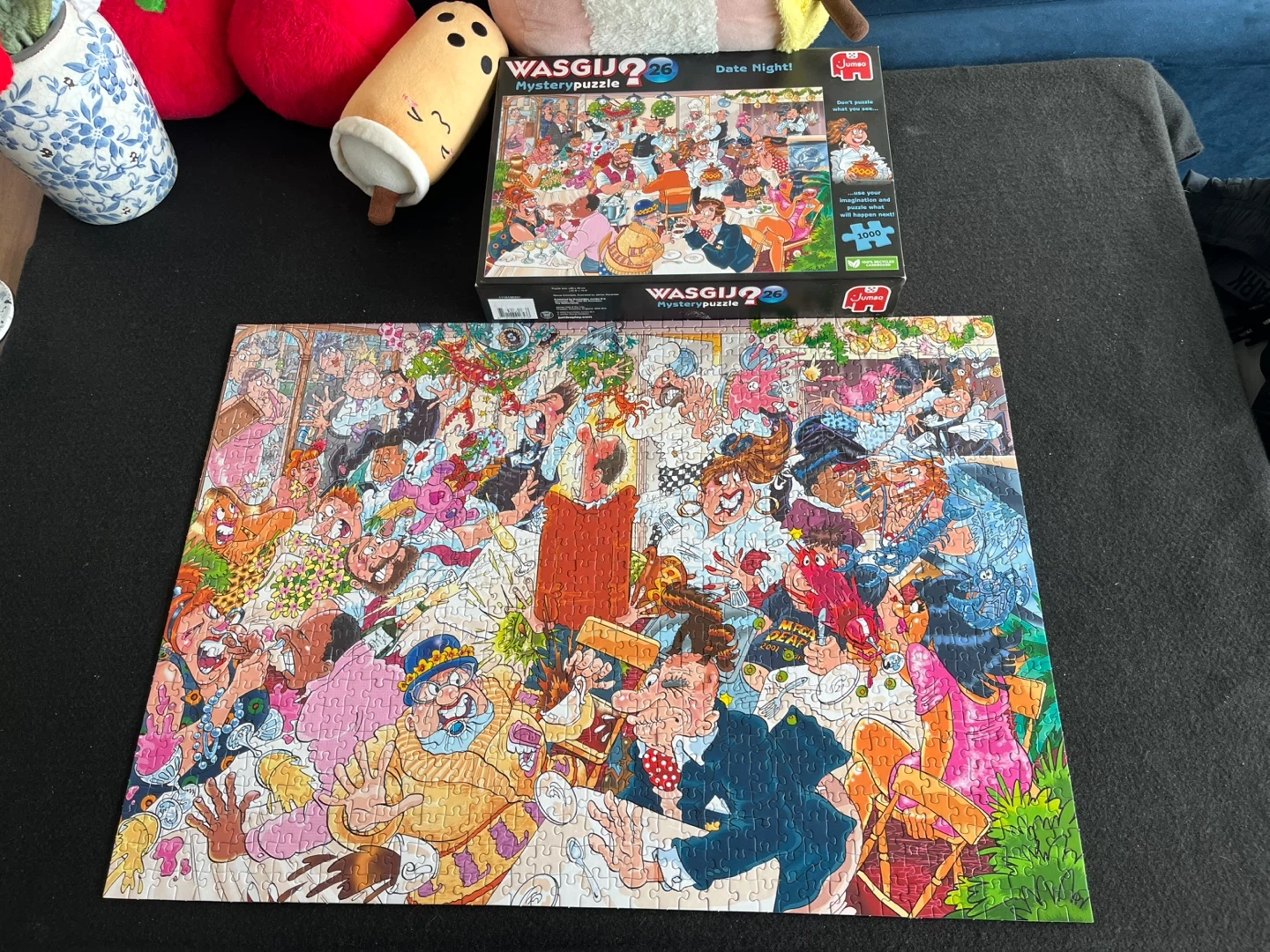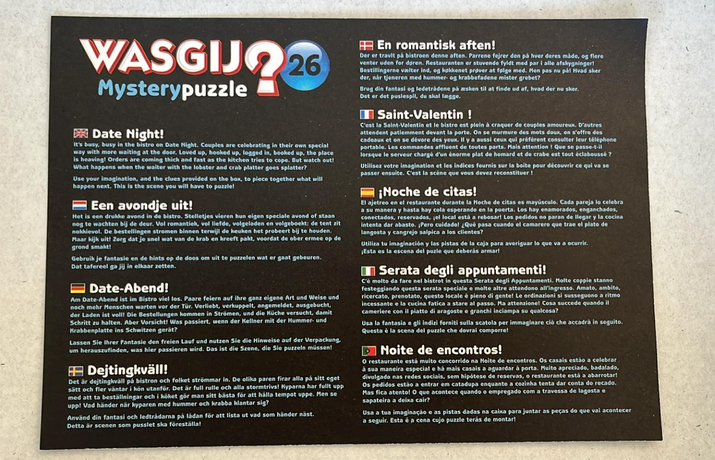This is Wasgij Mystery Puzzle 26, "Date Night!". It includes the puzzle and its box. How it works: the box depicts a scene, and the puzzle depicts a slightly different image (mystery) based on the scenario!