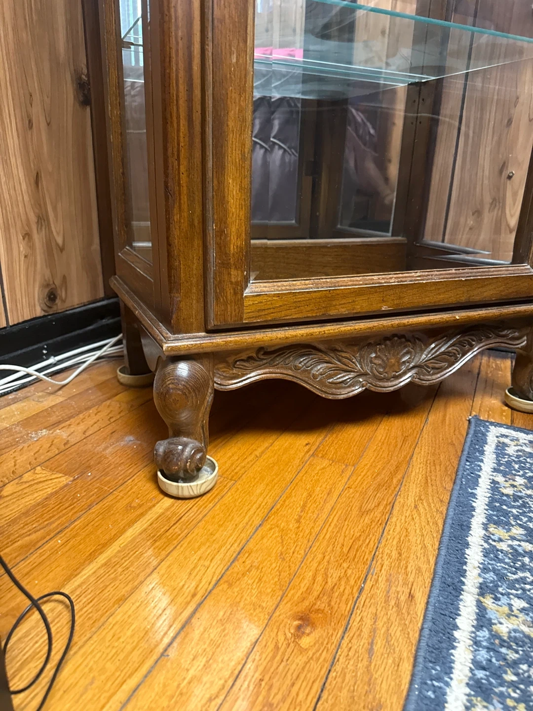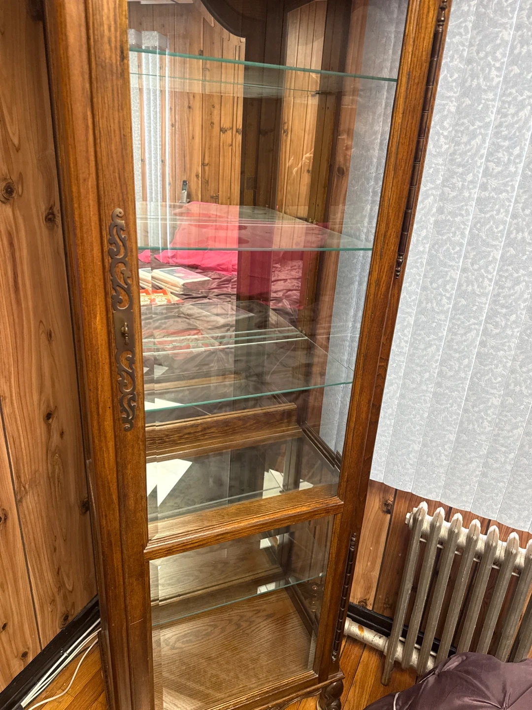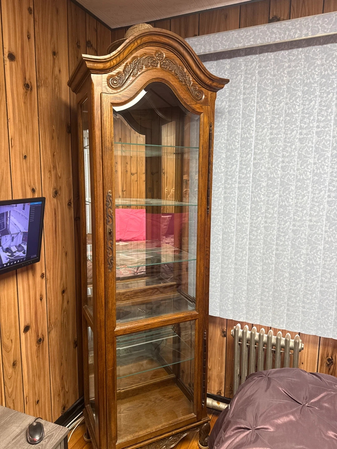 This beautiful display cabinet features a rich wood finish and glass shelving. It's perfect for showcasing collectibles or decor. Includes ornate carved details and a curved top.