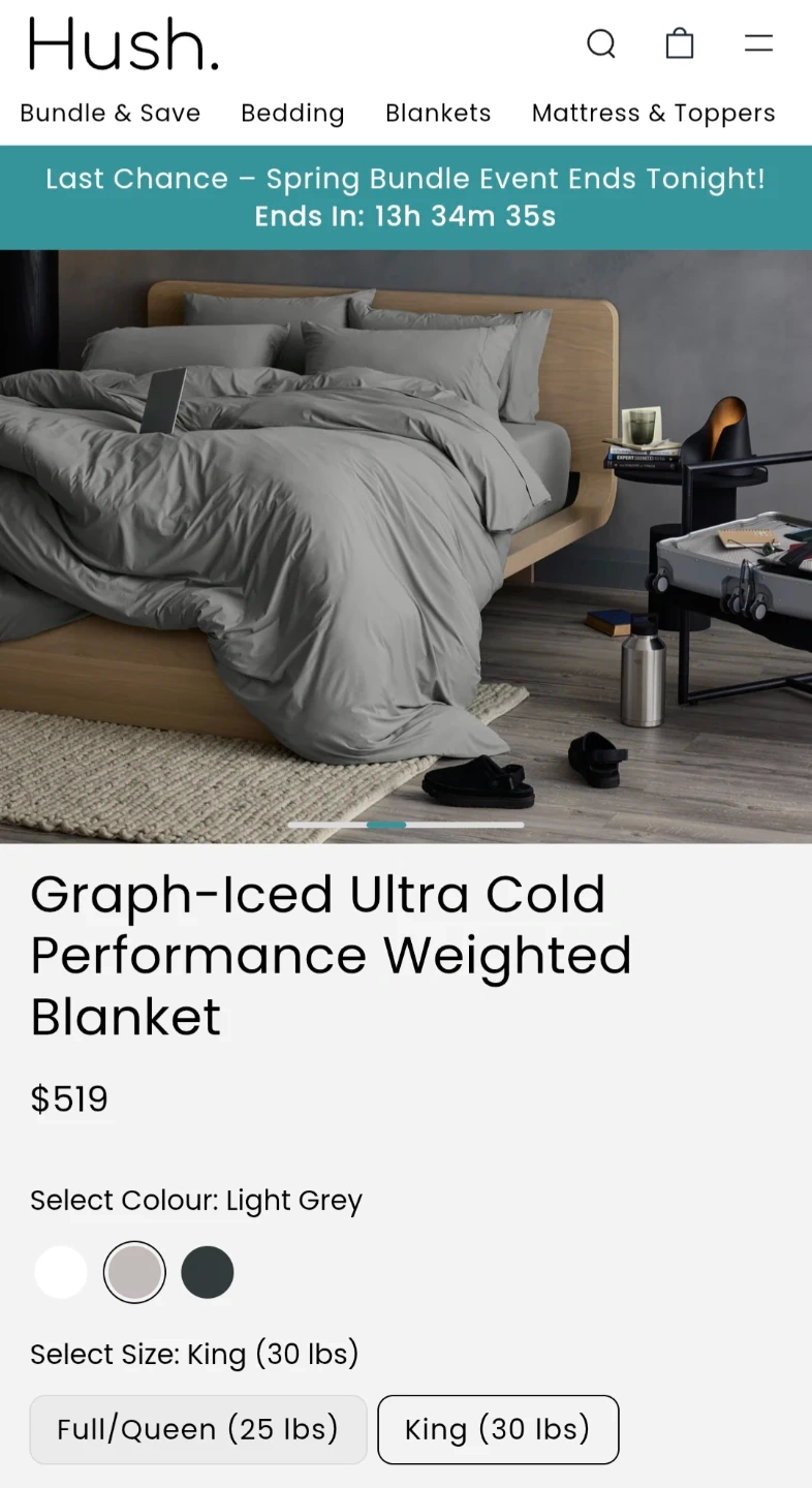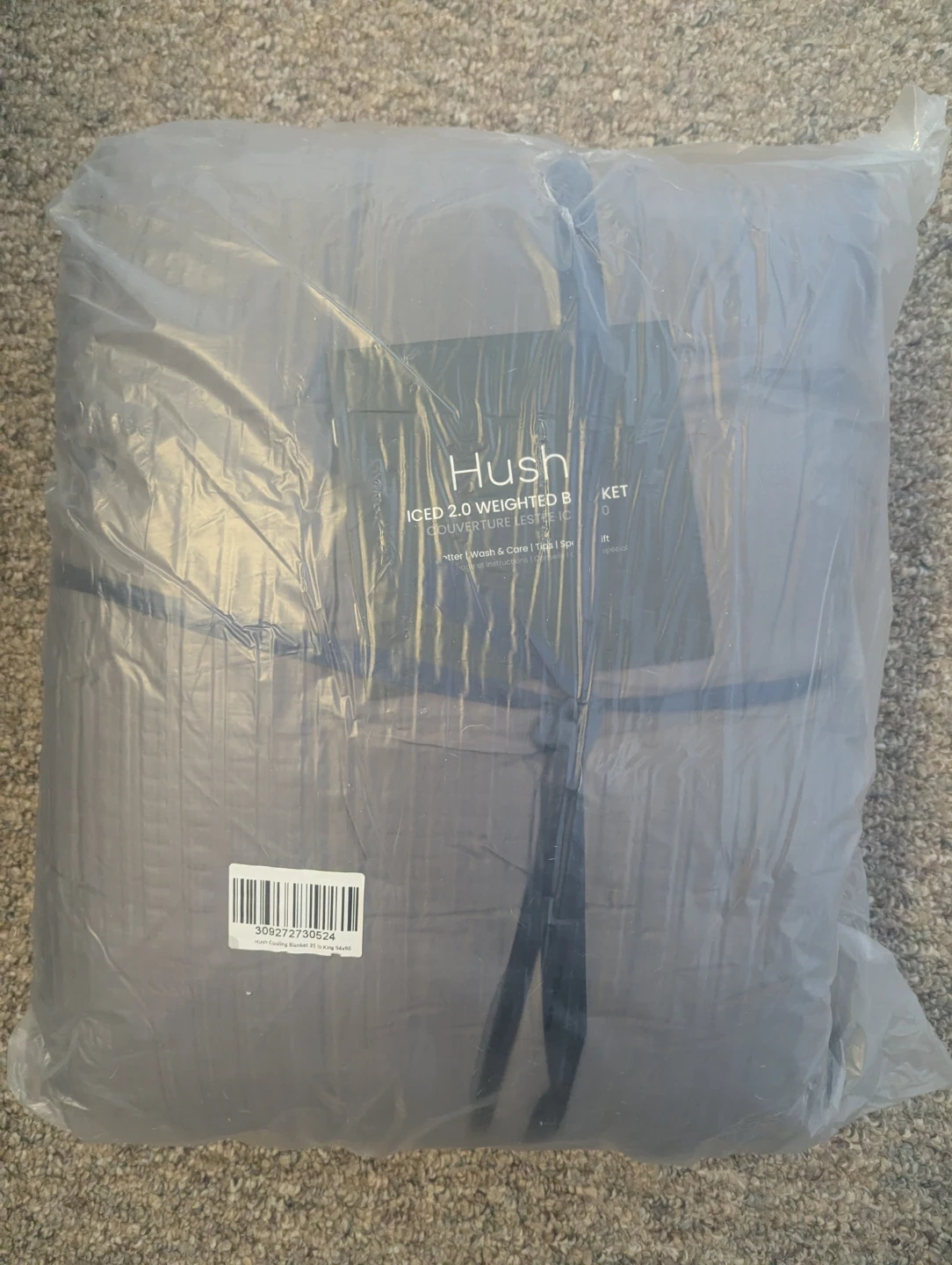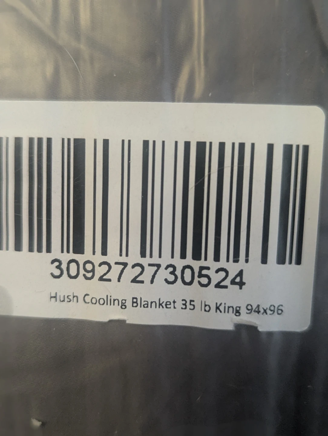 Hush Cooling Blanket in King size, weighing 35 lbs. It's designed for cooling performance. Measures 94x96 inches. New in plastic. I cannot do weighted blankets.