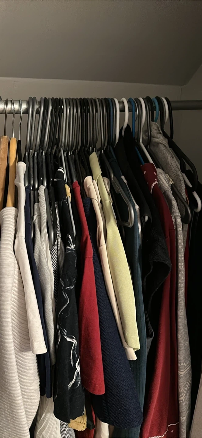 A collection of various women's tops and sweaters. Includes a white ribbed sweater, a navy blue long-sleeved shirt, and a black top with a white swirl pattern. You'll also find a red t-shirt and a pale yellow top. Most items appear to be size medium.