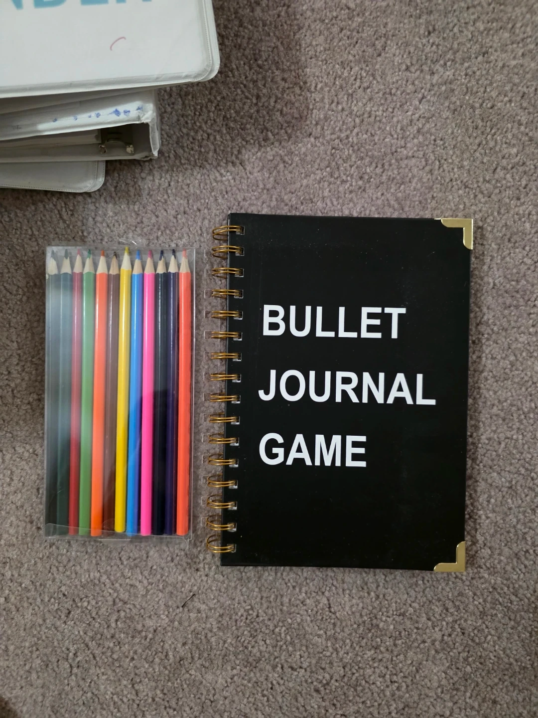 This set includes a black spiral-bound notebook labelled "Bullet Journal Game" and a clear case of coloured pencils. The notebook has gold corner protectors and a gold spiral binding. A variety of coloured pencils are included in the plastic case.