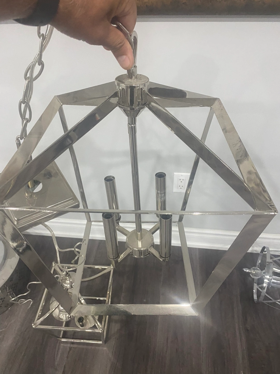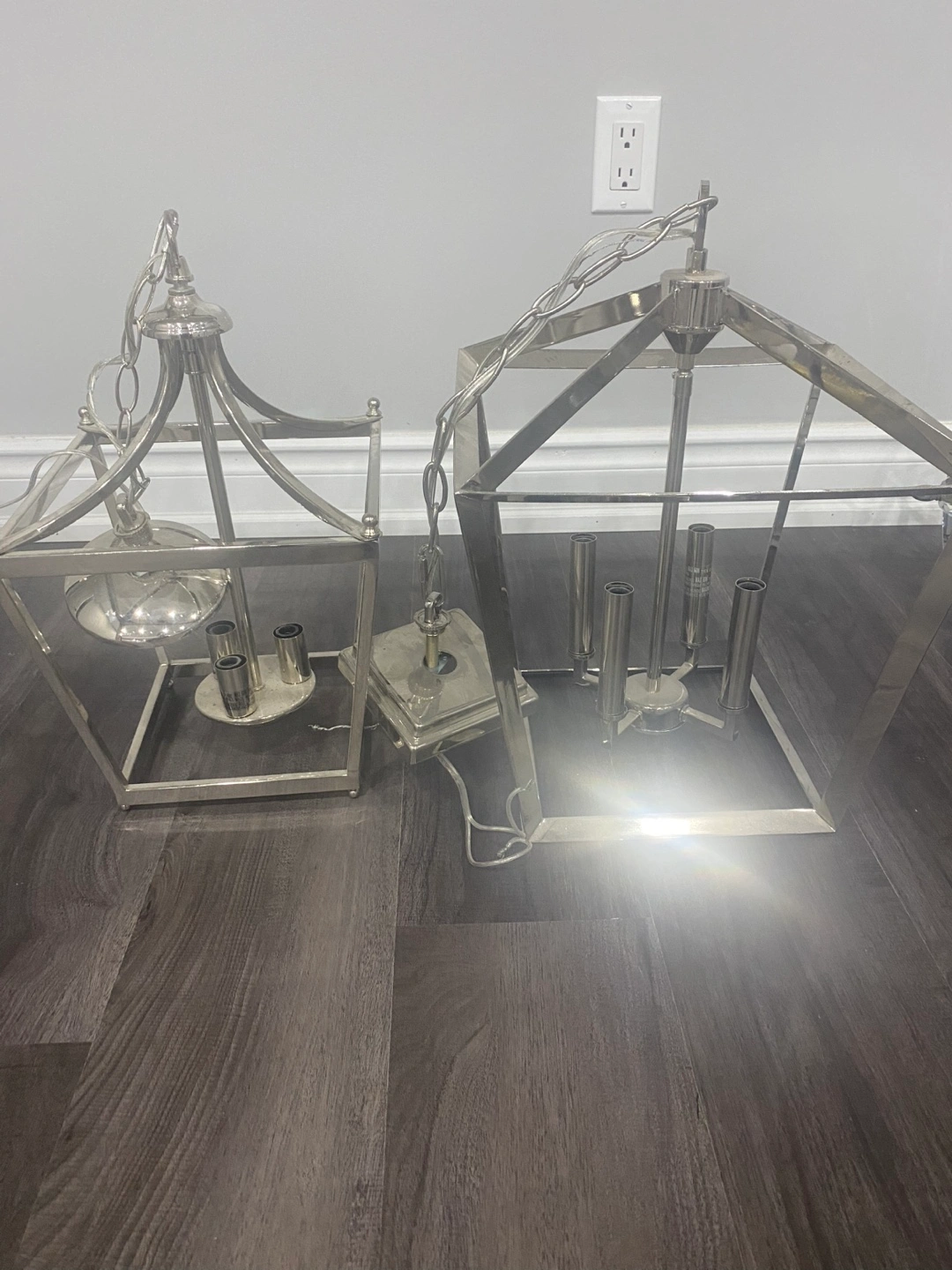 Two silver chandeliers, one larger and one smaller. Both are in great condition. The larger one is $100 and the smaller one is $75