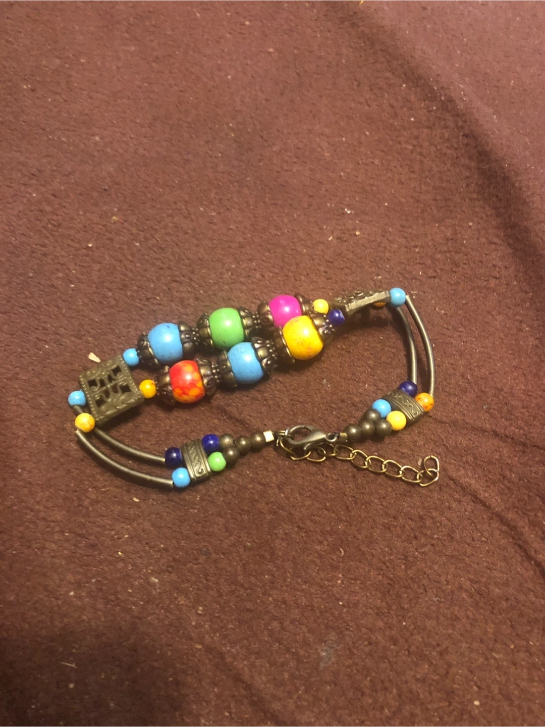 This colourful beaded bracelet features a mix of glass beads and metal charms. It has a lobster clasp closure with an adjustable chain. It's a unique accessory for everyday wear!