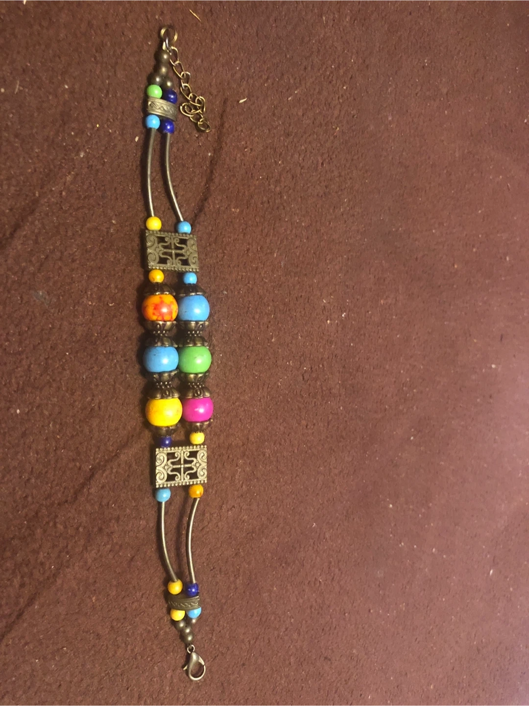 This colourful beaded bracelet features a mix of glass beads and metal charms. It has a lobster clasp closure with an adjustable chain. It's a unique accessory for everyday wear!