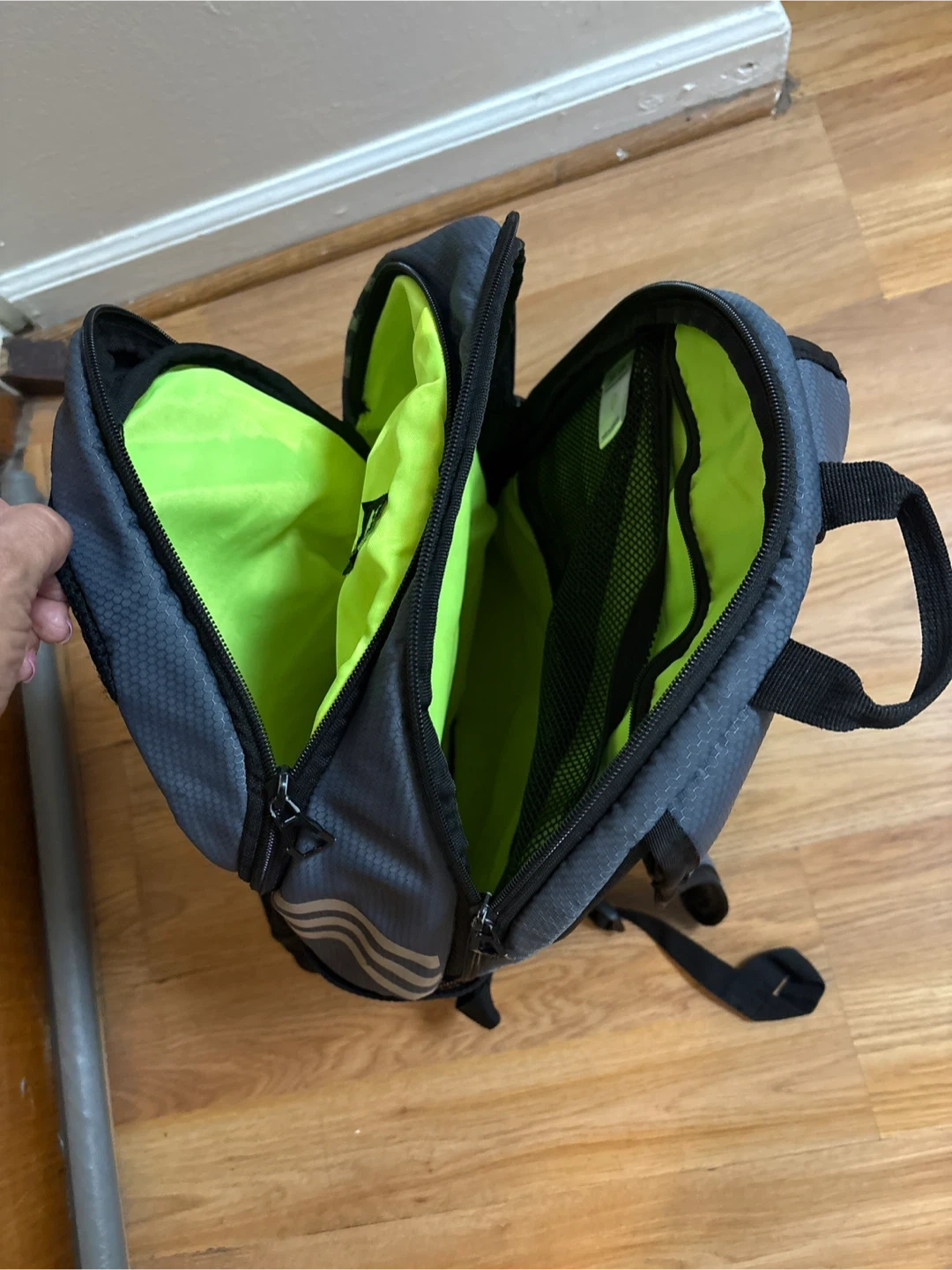 This is an Adidas backpack in black and grey. It features padded shoulder straps and multiple compartments for storage. The interior has a bright neon green lining.