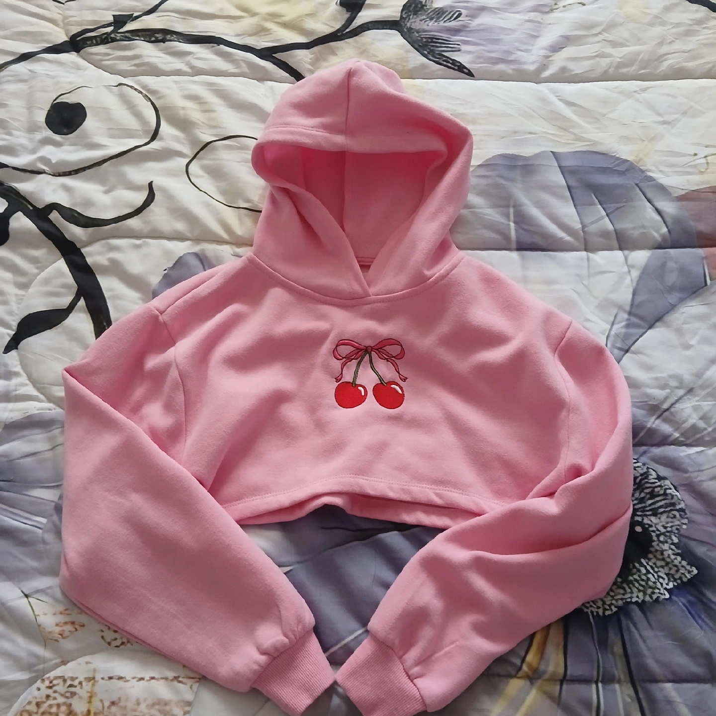 Selling a cute pink crop hoodie! It features an embroidered cherry design on the front. It's in great condition and perfect for layering or wearing on its own. The material feels soft and comfy. It would be a great addition to your wardrobe! size 10-12 kids