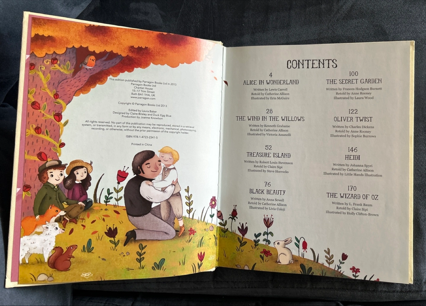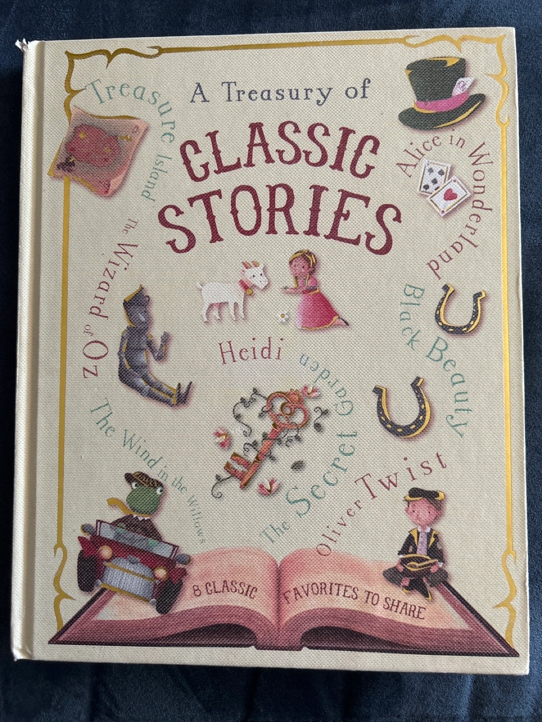 I'm selling a book called 'A Treasury of Classic Stories'. It includes stories such as Alice in Wonderland, The Wind in the Willows, Treasure Island, Black Beauty, The Secret Garden, Oliver Twist, Heidi, and The Wizard of Oz. It's a collection of 8 classic favorites to share! Glossy pages. Beautiful artwork
