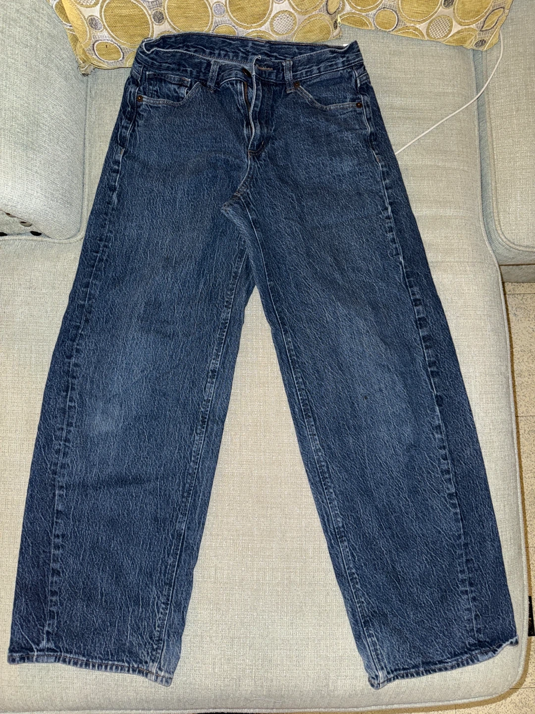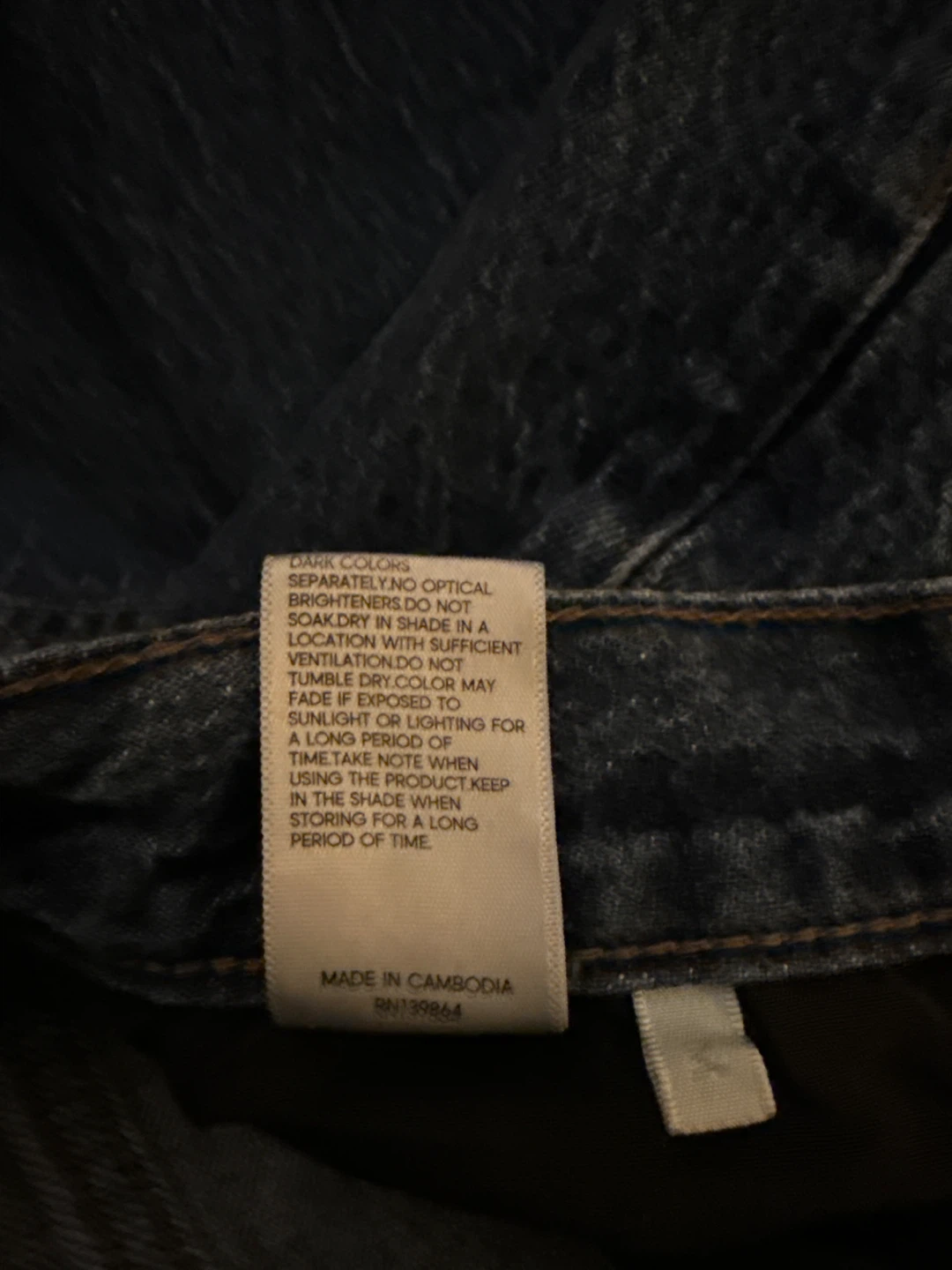 These GU jeans are made from a blend of 99% cotton and 1% spandex. They're a dark wash denim. Machine wash cold on a gentle cycle. Do not bleach, line dry, warm iron, do not dryclean.