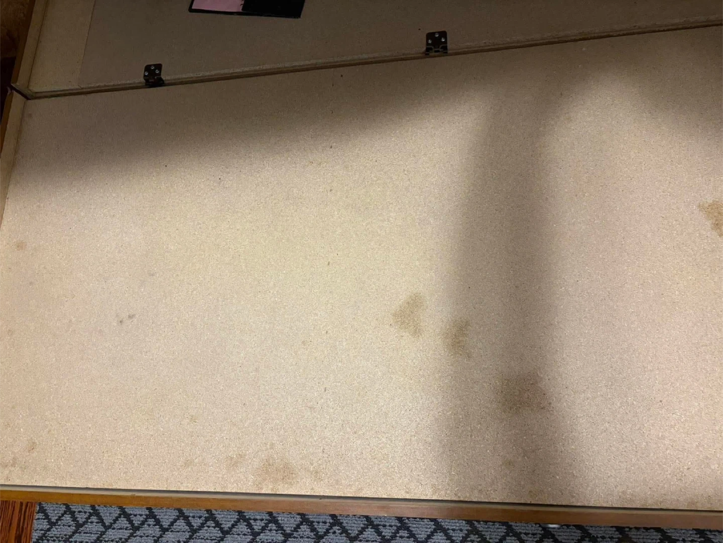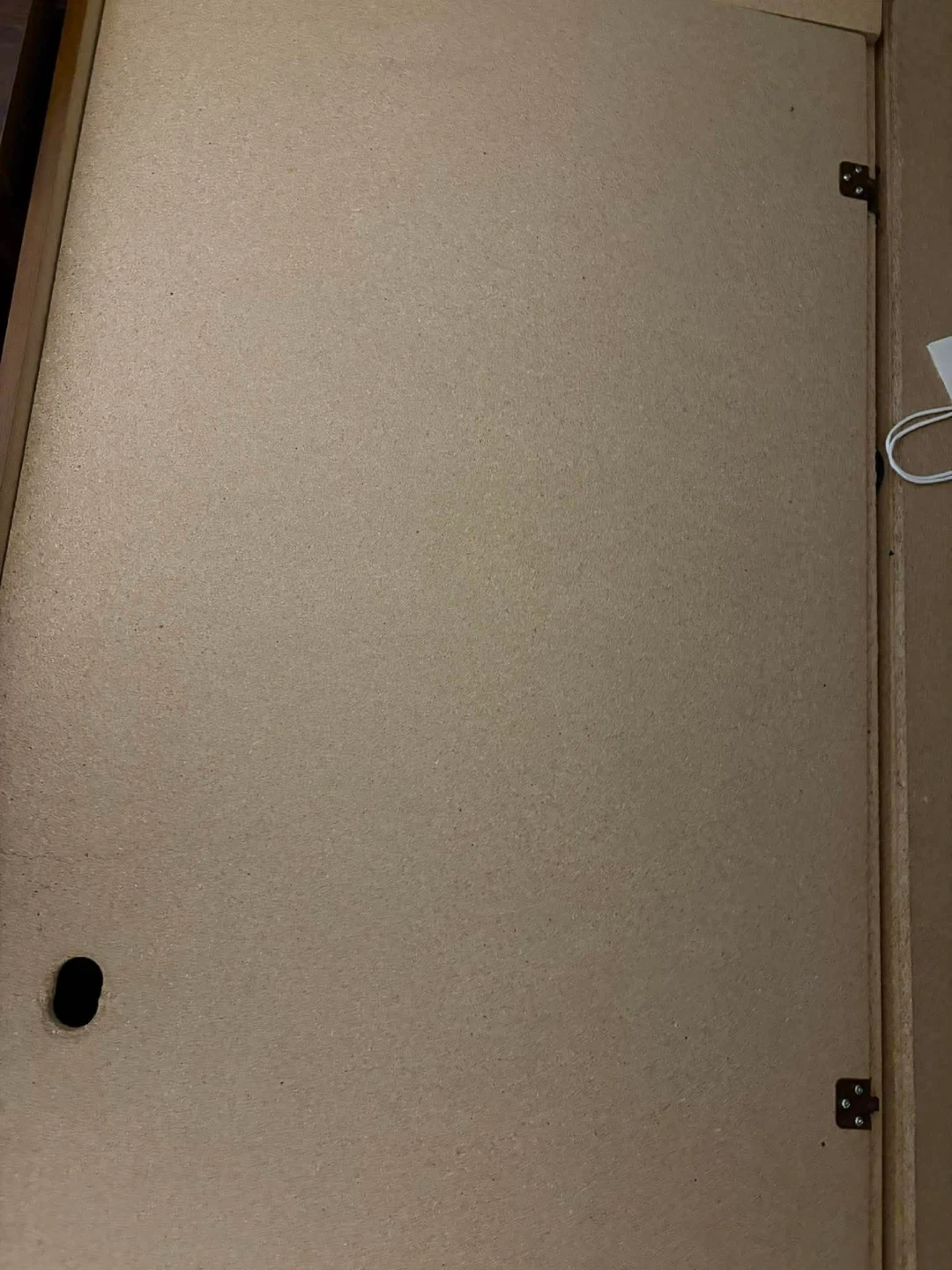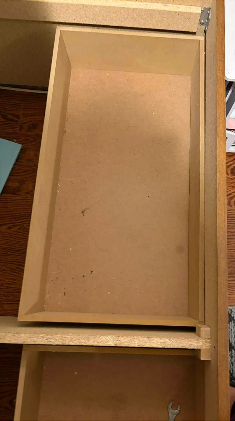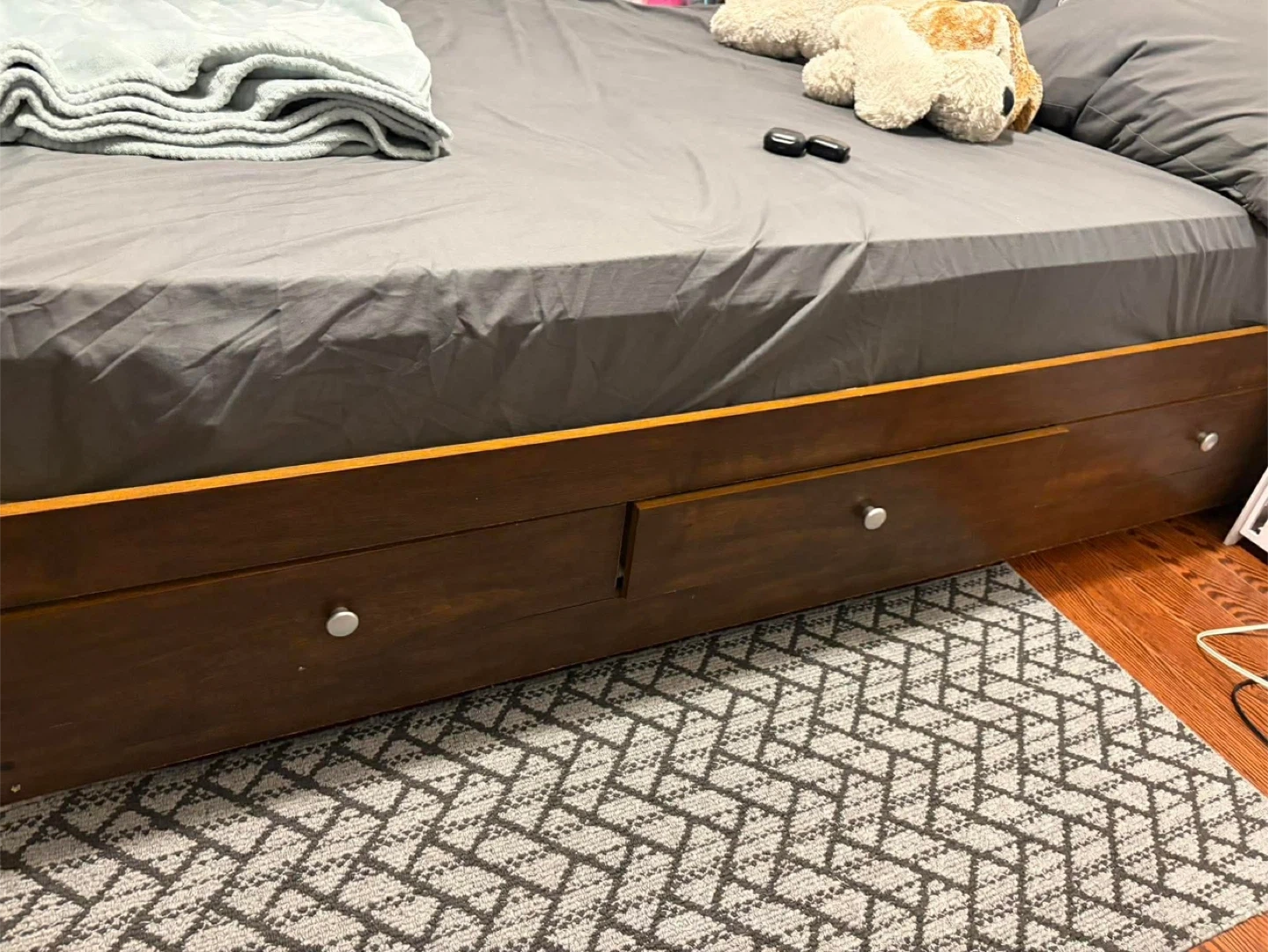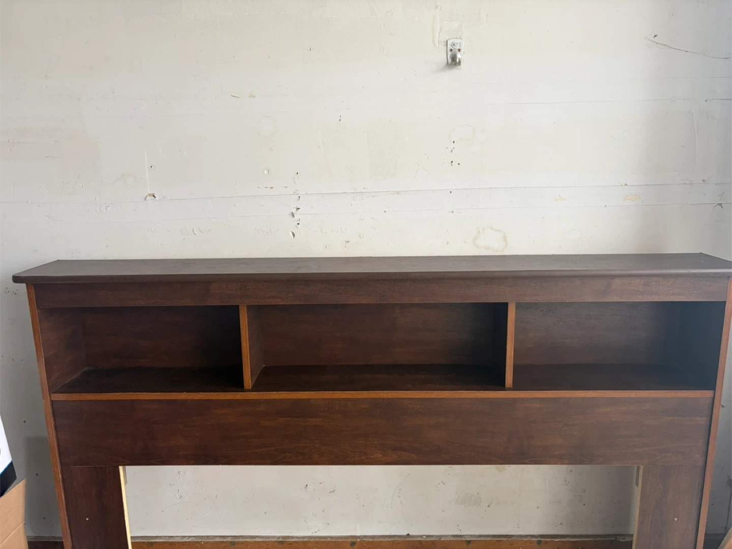 This is a sturdy wooden headboard with a built-in shelf. It also includes three large storage drawers that fit under the bed frame. The wood finish is a warm, dark brown.
